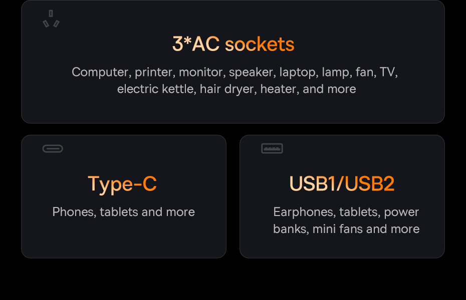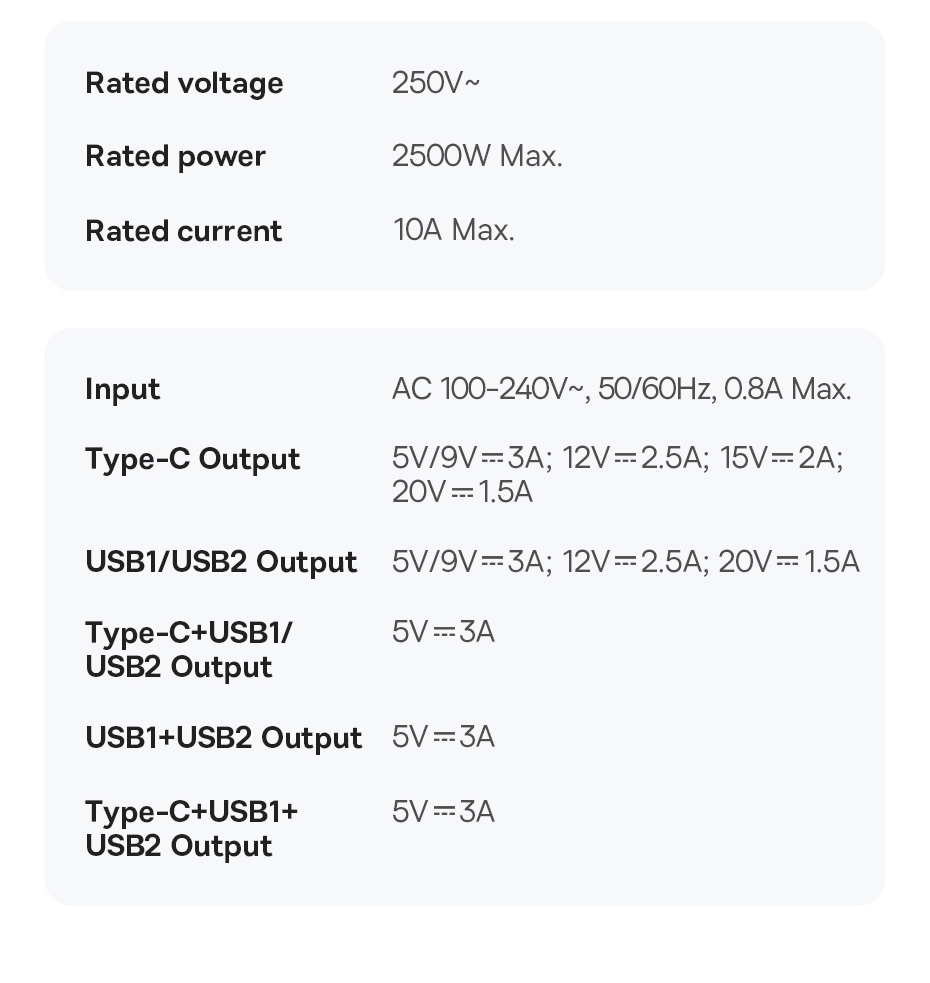 | Type-C + USB1 + USB2 Output | 5V-3A |