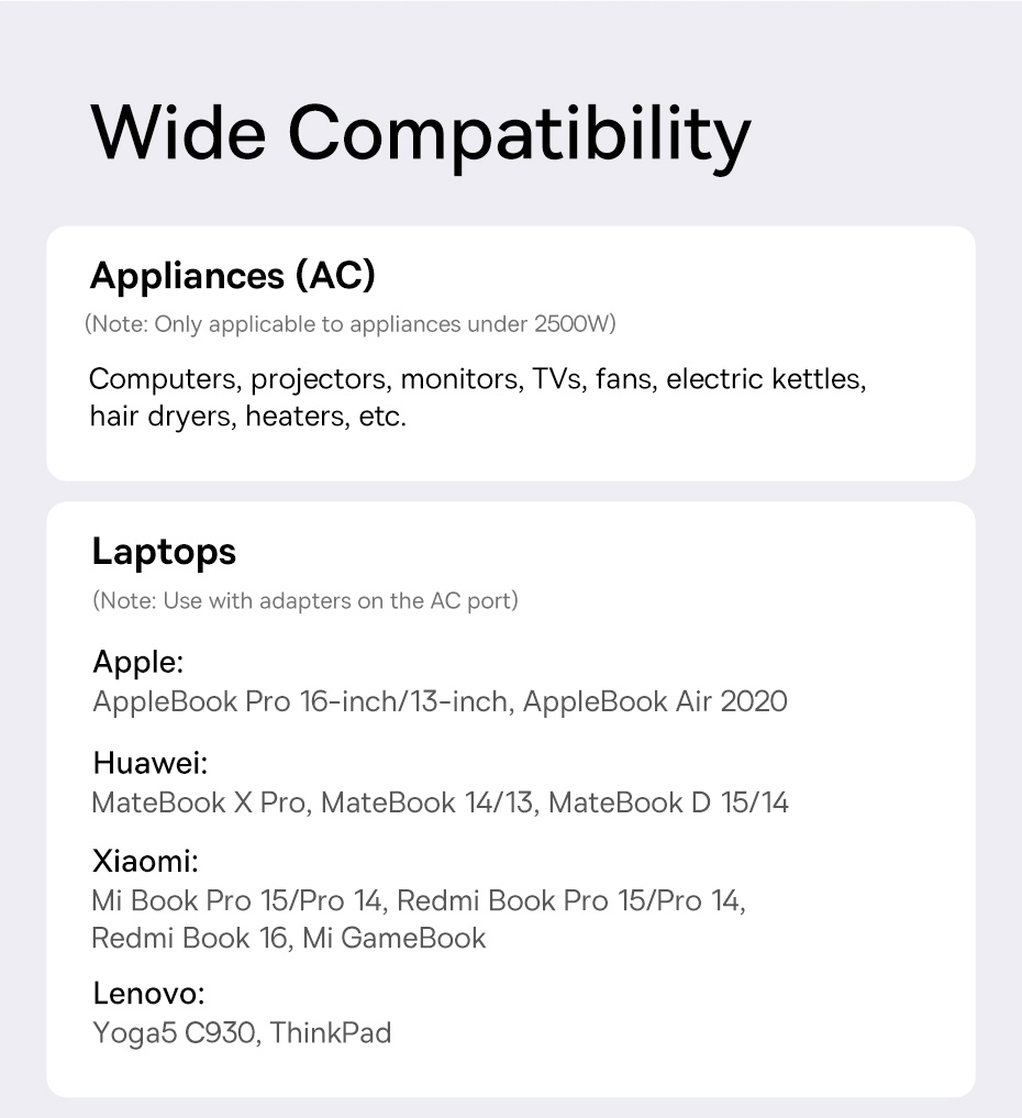 Hỗ trợ công suất tối đa 2500W, sử dụng cho các thiết bị tiện ích như : Đèn, Quạt, Laptop, Màn hình, Bộ sạc, Router wifi, Sấy tóc....