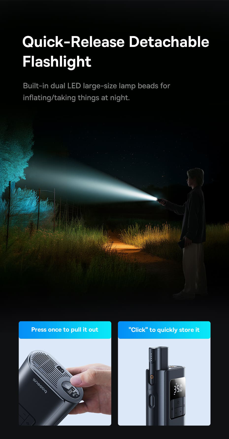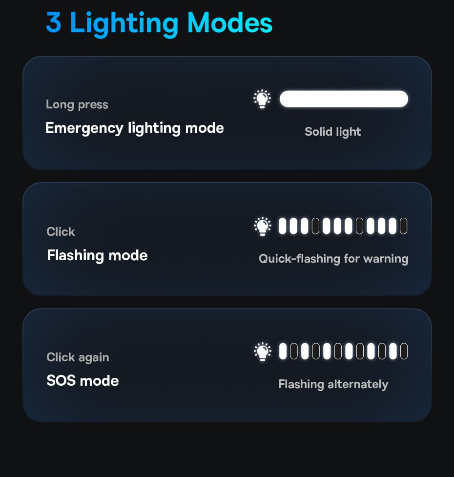 🔦 Tích Hợp Đèn LED Cứu Hộ: Đèn LED siêu sáng tích hợp giúp bạn dễ dàng thao tác trong bóng tối. Đèn còn có các chế độ chớp nháy và SOS để cảnh báo các phương tiện khác hoặc gọi trợ giúp khi cần.