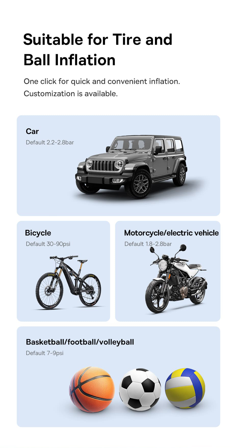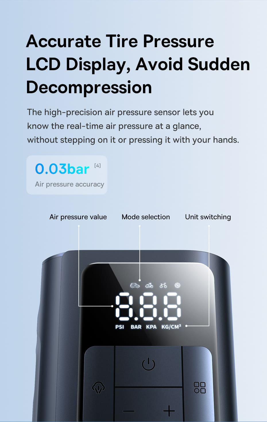 🎯 Bơm Thông Minh & Tự Động Ngắt: Không cần phải canh chừng! Chỉ cần cài đặt áp suất lốp mong muốn trên màn hình kỹ thuật số, nhấn nút và máy sẽ tự động bơm đến đúng áp suất rồi ngắt. Cực kỳ chính xác, tiện lợi và an toàn, chống nổ lốp do bơm quá căng.