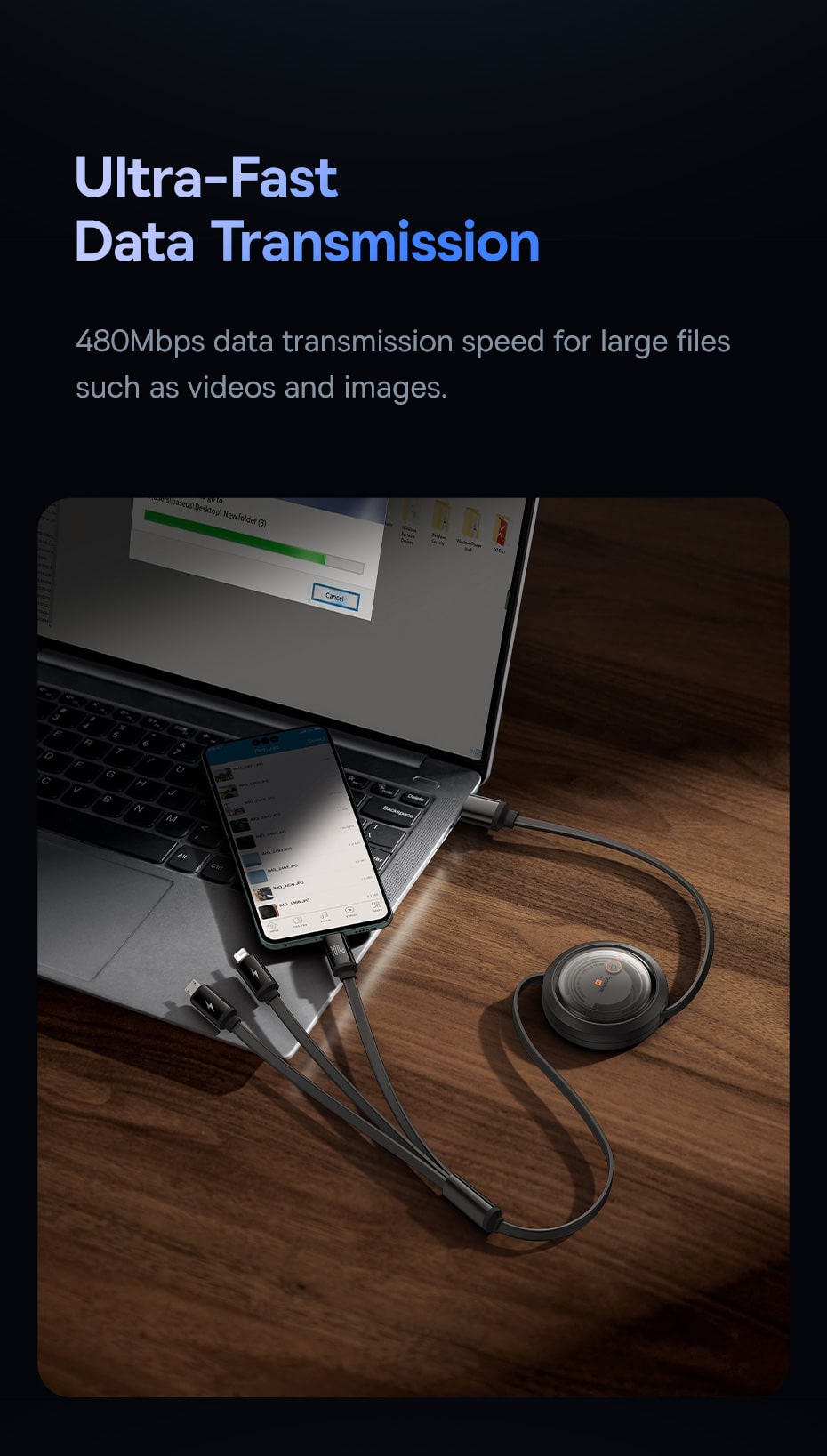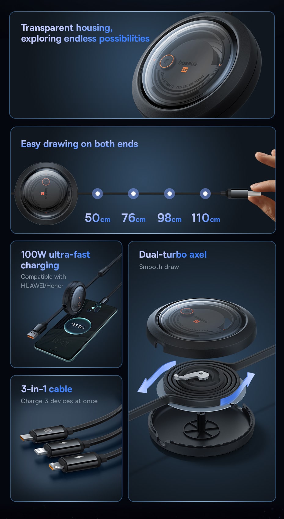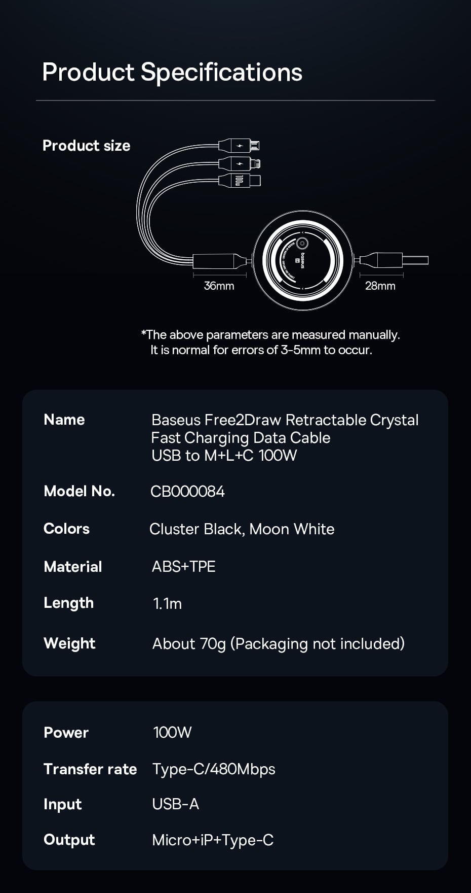 | Tên | Cáp Sạc Đa Năng Baseus Free2Draw Retractable Crystal Fast Charging Data Cable USB to M+L+C 100W |