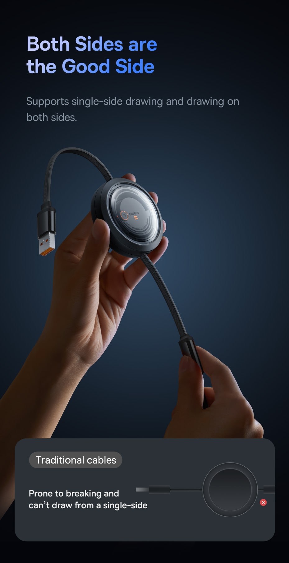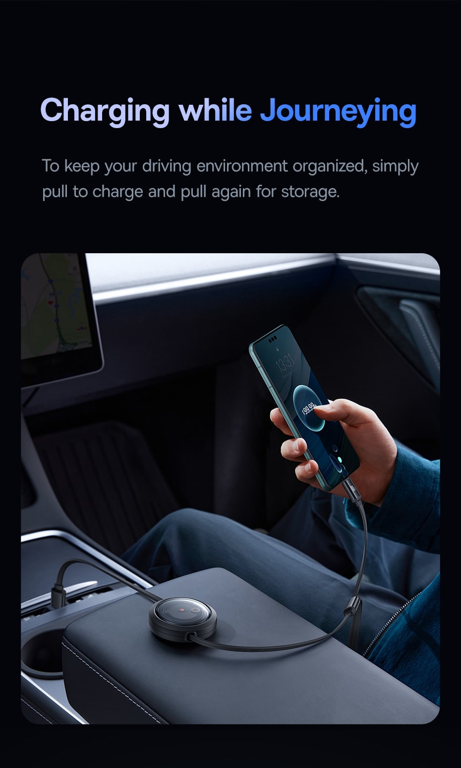 👌 CƠ CHẾ RÚT GỌN THÔNG MINH - GỌN GÀNG TỨC THÌ: Cơ chế "Free2Draw" cải tiến cho phép bạn kéo dài cáp một cách mượt mà, thậm chí có thể kéo chỉ từ một phía. Cáp có nhiều nấc điều chỉnh độ dài (tối đa 1.1m), giúp bạn tùy chỉnh khoảng cách sạc hoàn hảo và giữ cho không gian xe hơi hay bàn làm việc luôn ngăn nắp.