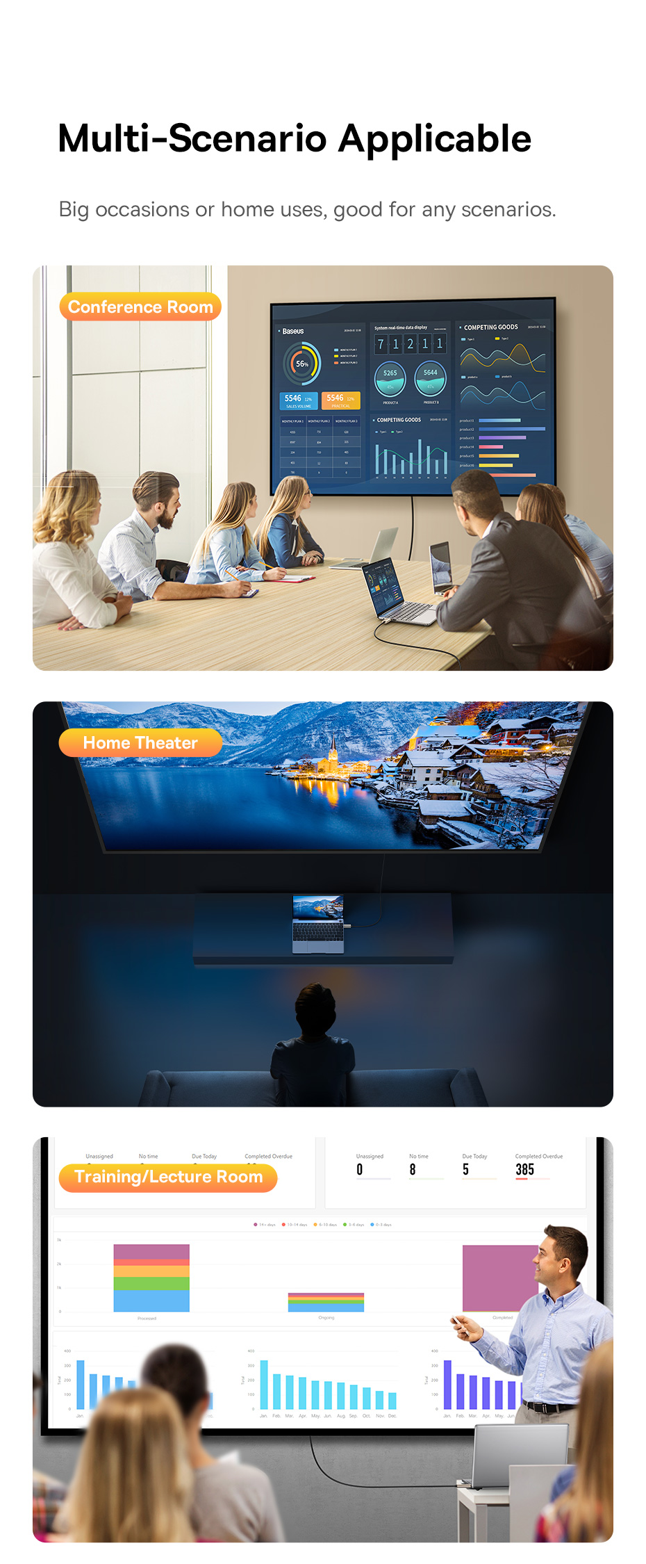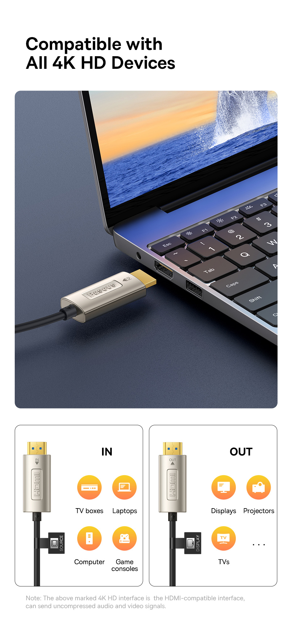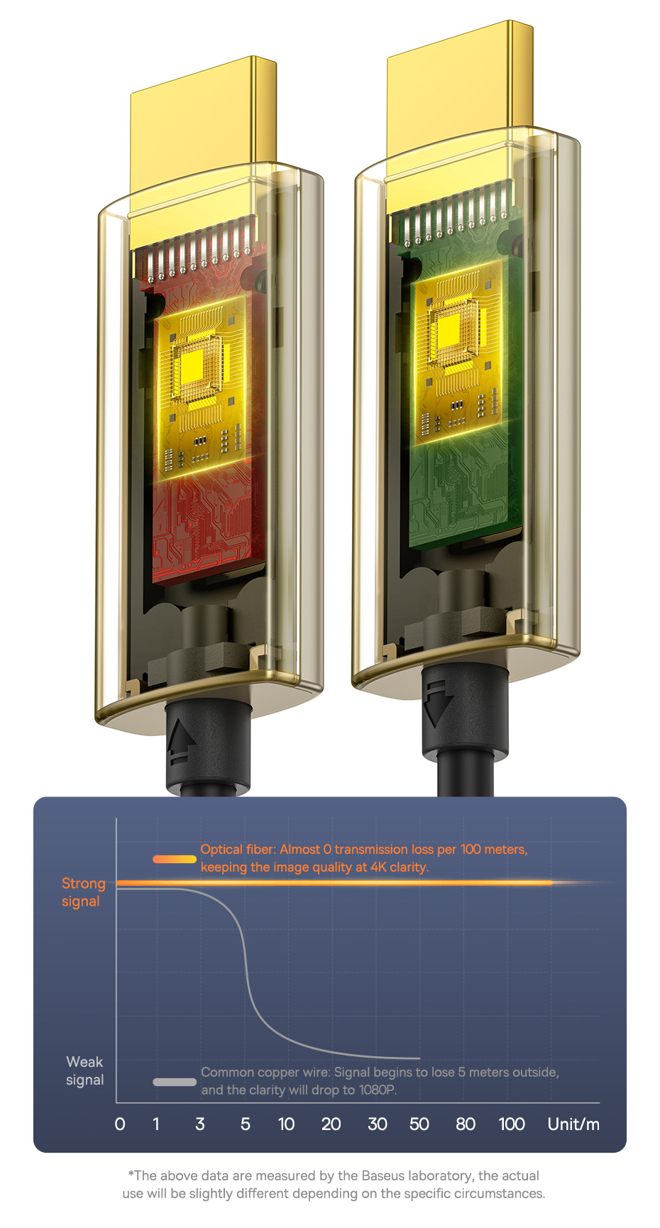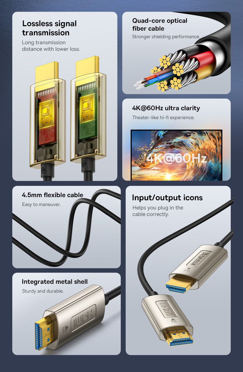 Bạn có biết rằng với khoảng cách xa, cáp HDMI thông thường có thể bị suy hao tín hiệu, gây nhiễu hoặc giảm chất lượng hình ảnh? Cáp HDMI Baseus sử dụng công nghệ lõi sợi quang tiên tiến để chuyển đổi tín hiệu điện thành ánh sáng, đảm bảo truyền tải hình ảnh 4K@60Hz và âm thanh một cách hoàn hảo, không suy hao, bất kể độ dài.