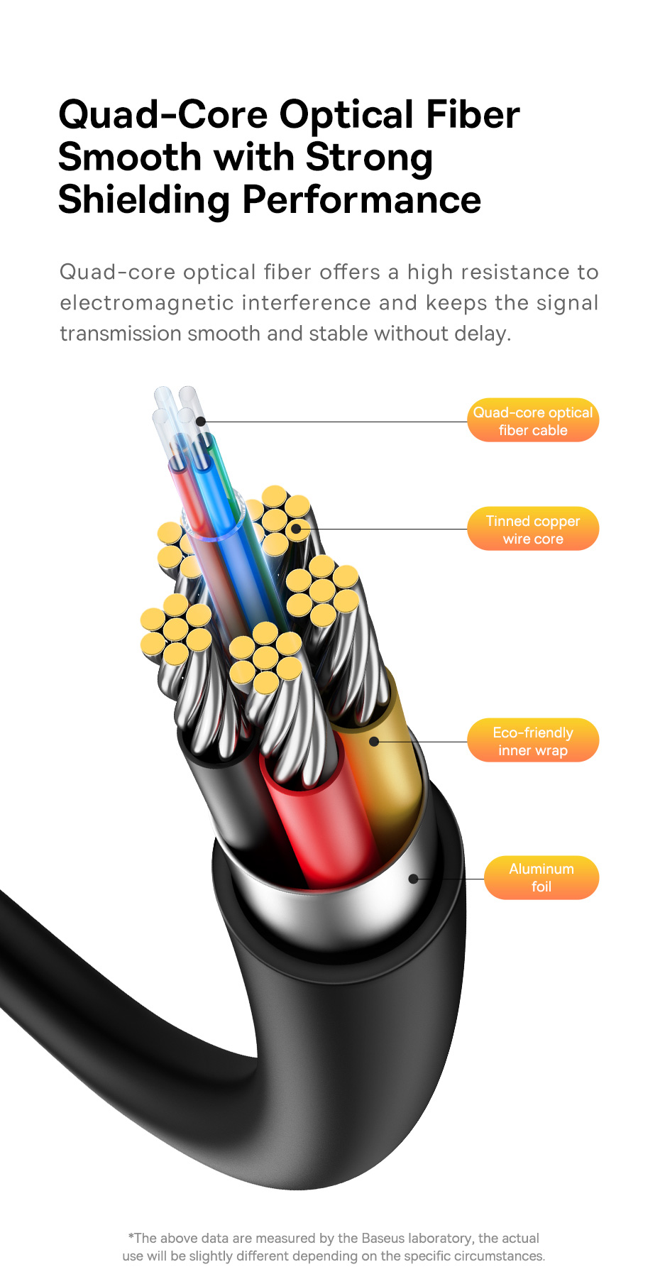 🚀 CÔNG NGHỆ TRUYỀN DẪN BẰNG SỢI QUANG: Nâng cấp toàn diện cho hệ thống nghe nhìn của bạn. Không giống cáp đồng thông thường, cáp Baseus sử dụng 4 lõi sợi quang để chuyển đổi tín hiệu, giúp truyền đi xa mà không hề bị suy hao hay bị ảnh hưởng bởi nhiễu điện từ, đảm bảo hình ảnh và âm thanh của bạn luôn đạt chất lượng hoàn hảo.