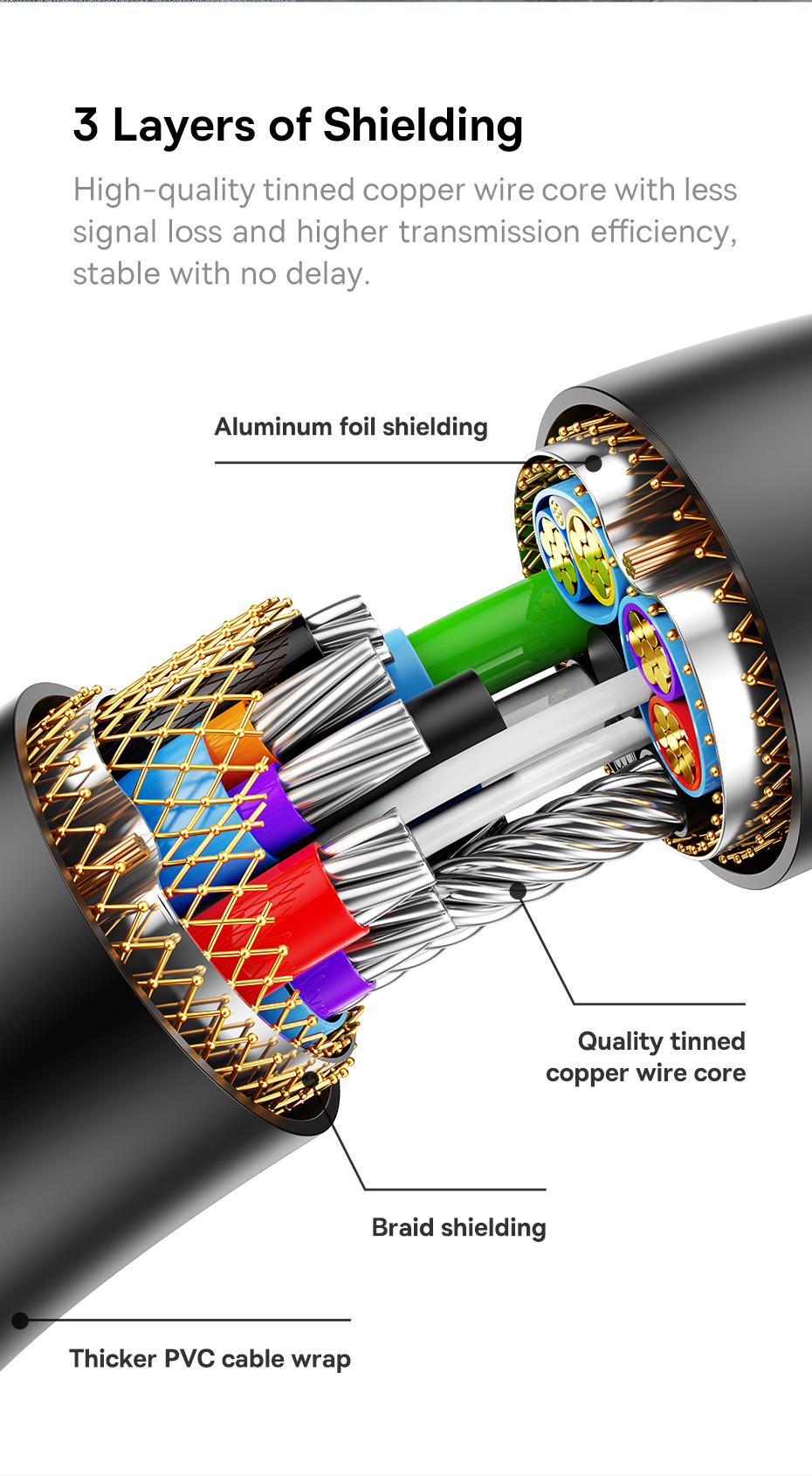 📡 TÍN HIỆU ỔN ĐỊNH, KHÔNG DELAY: Cấu tạo lõi đồng nguyên chất được làm dày và bọc nhiều lớp chống nhiễu cao cấp, đảm bảo tín hiệu được truyền đi một cách ổn định và mượt mà, không bị gián đoạn hay suy hao ngay cả khi sử dụng cáp dài.