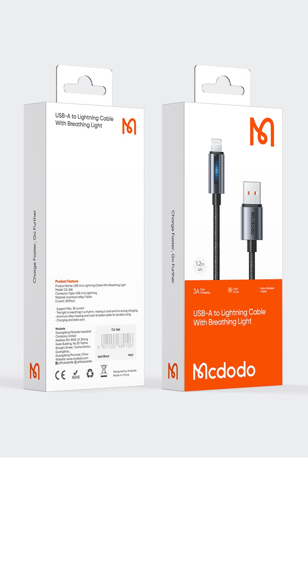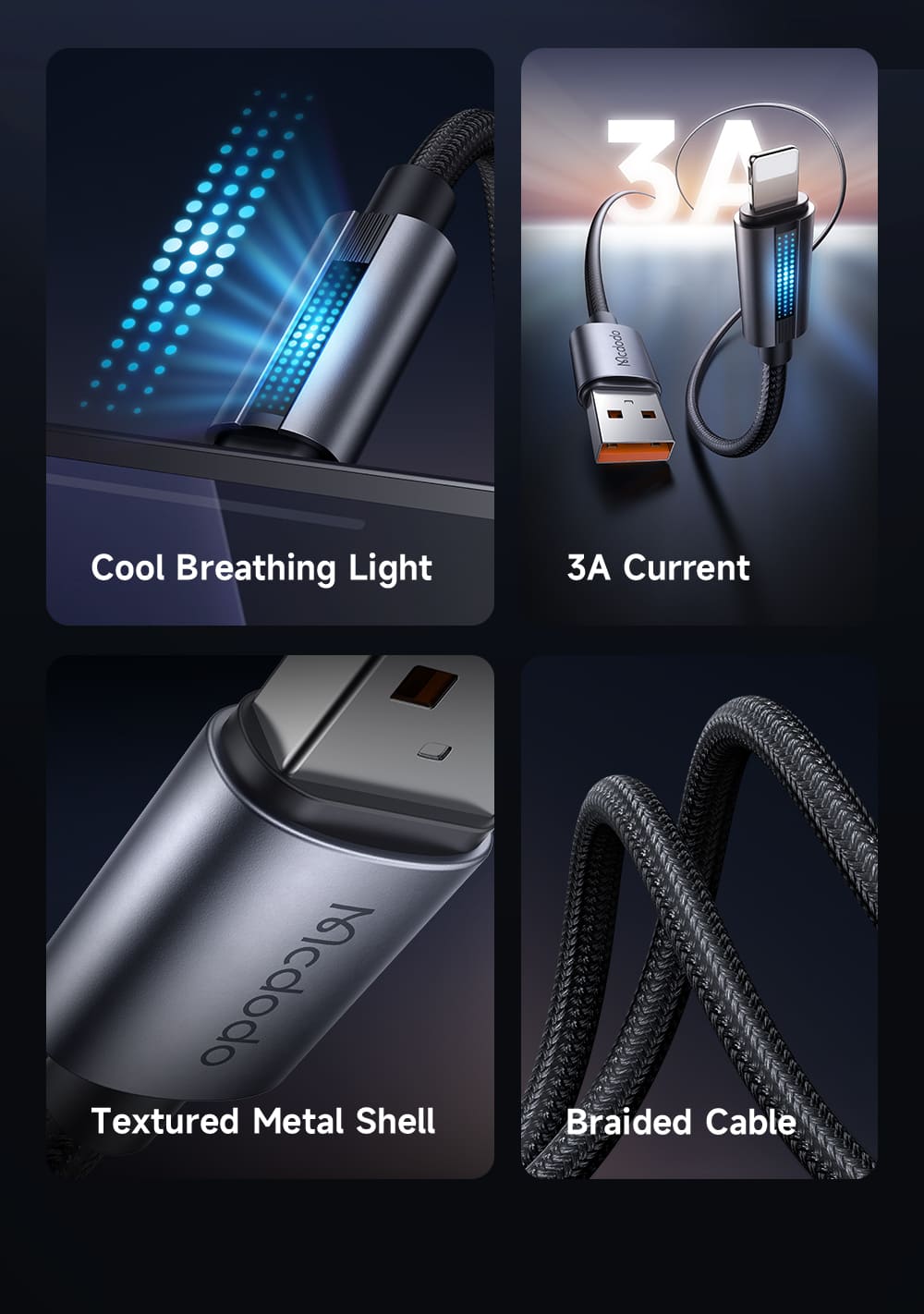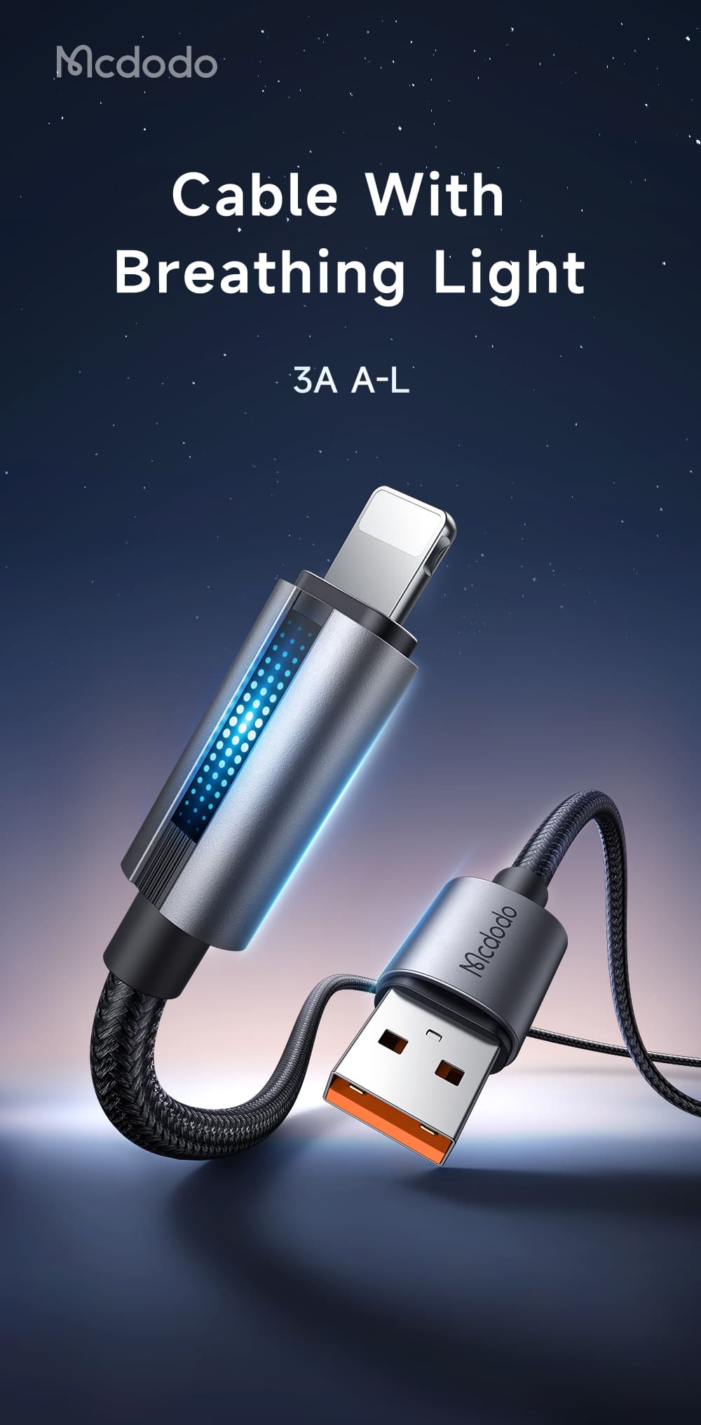 Cáp Sạc Mcdodo USB to Ln 3A | Có Đèn LED "Hơi Thở" Báo Sạc Độc Đáo, Dây Dù, Vỏ Hợp Kim