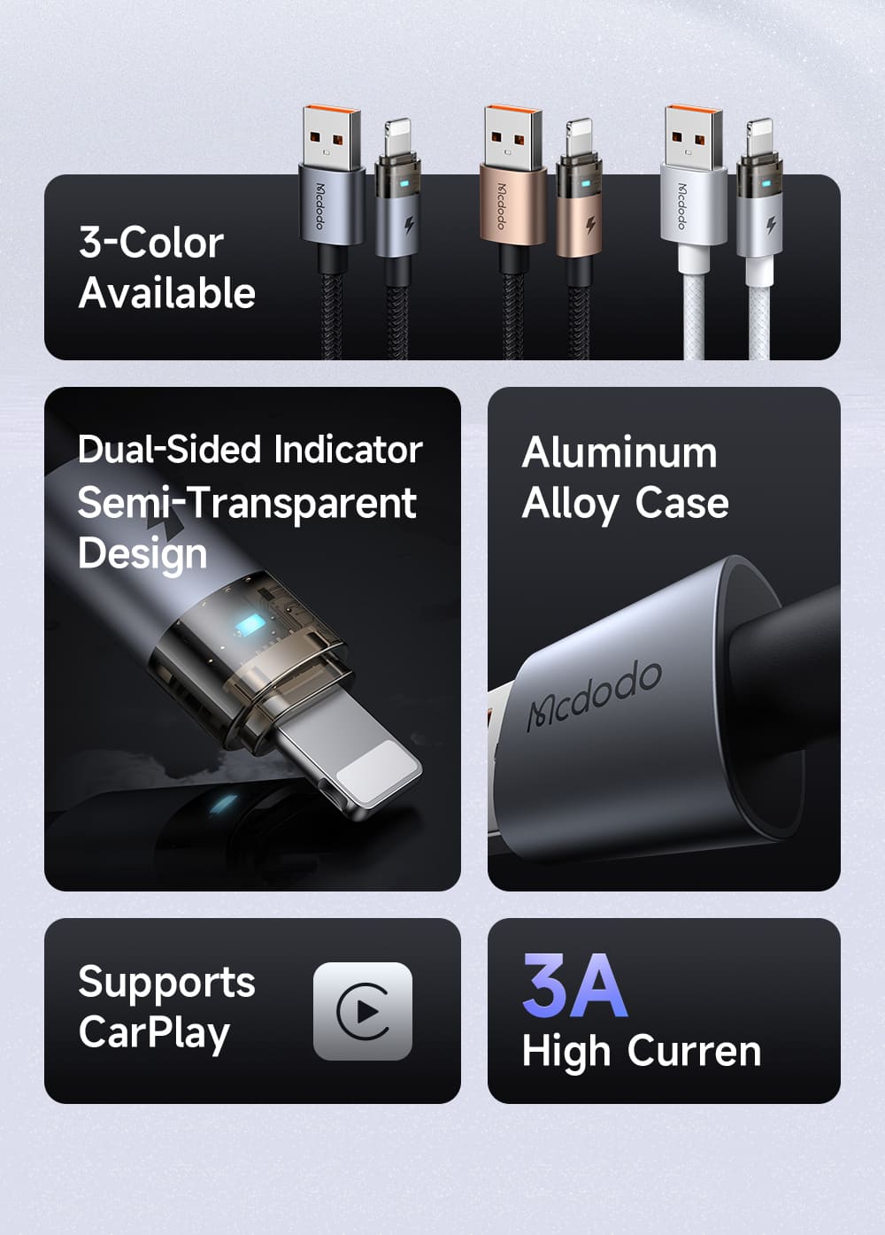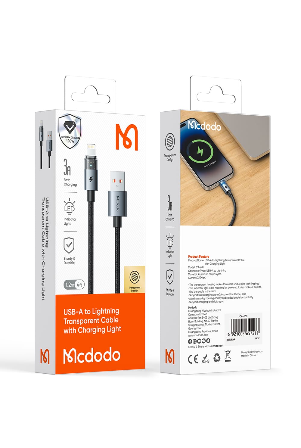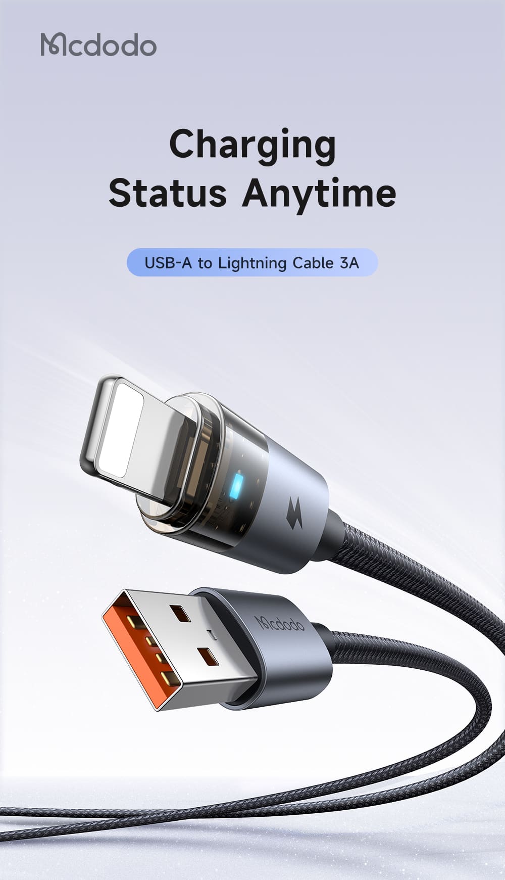 Cáp Sạc Nhanh Mcdodo 3A USB to Ln | Thiết Kế Trong Suốt Lộ Mạch, Có Đèn LED