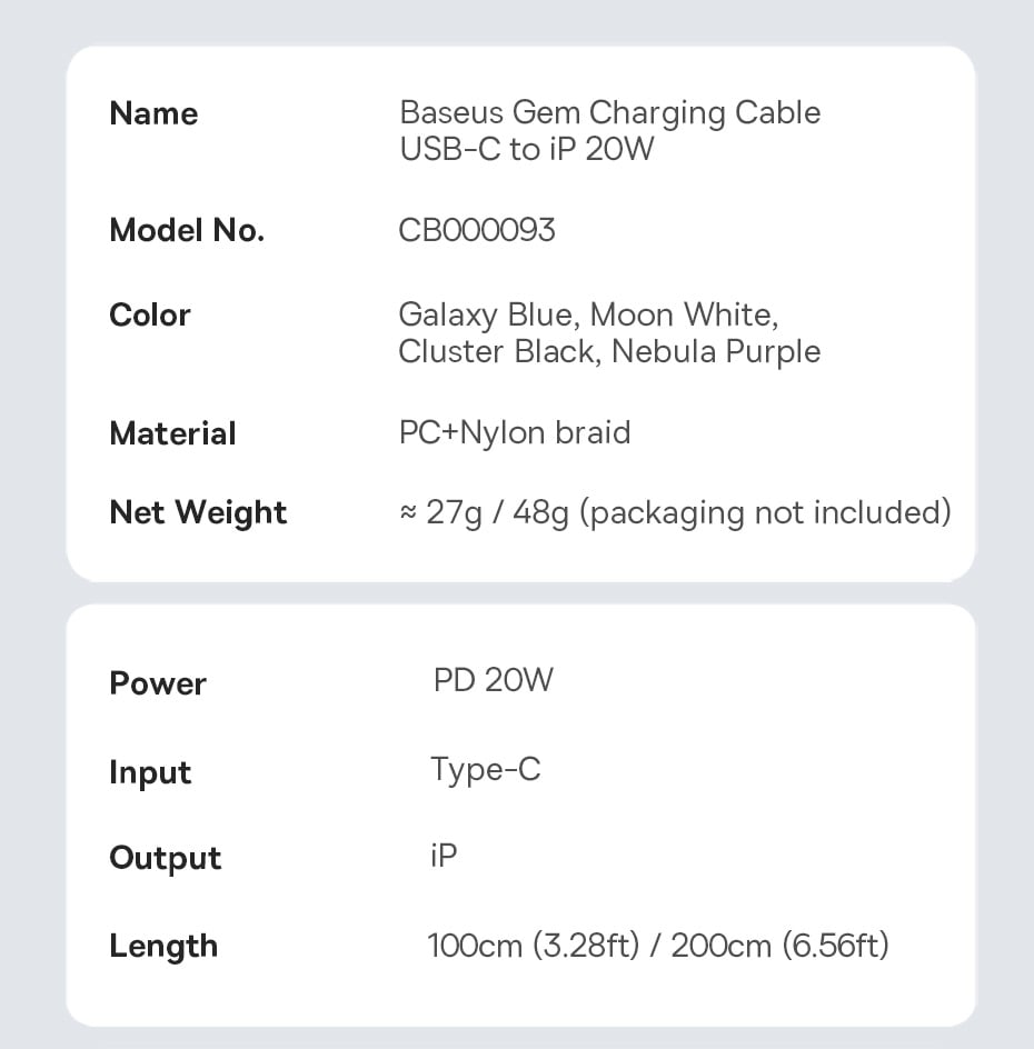 | Tên | Cáp Sạc Nhanh Baseus Gem Fast-Charging Data Cable Type-C to iP 20W |