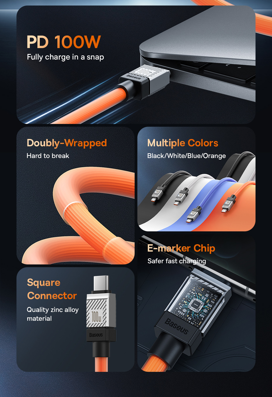 Đừng để một sợi cáp sạc mỏng manh làm gián đoạn công việc của bạn! Để sạc nhanh và an toàn cho các thiết bị công suất cao, bạn cần một sợi cáp đủ mạnh mẽ và thông minh. Cáp Sạc Baseus CoolPlay 100W được sinh ra để đáp ứng những yêu cầu khắt khe nhất, với kết cấu siêu bền bỉ và công suất sạc lên đến 100W.