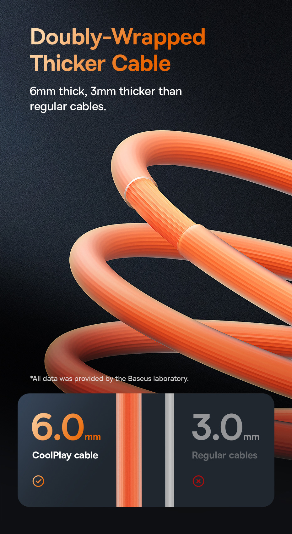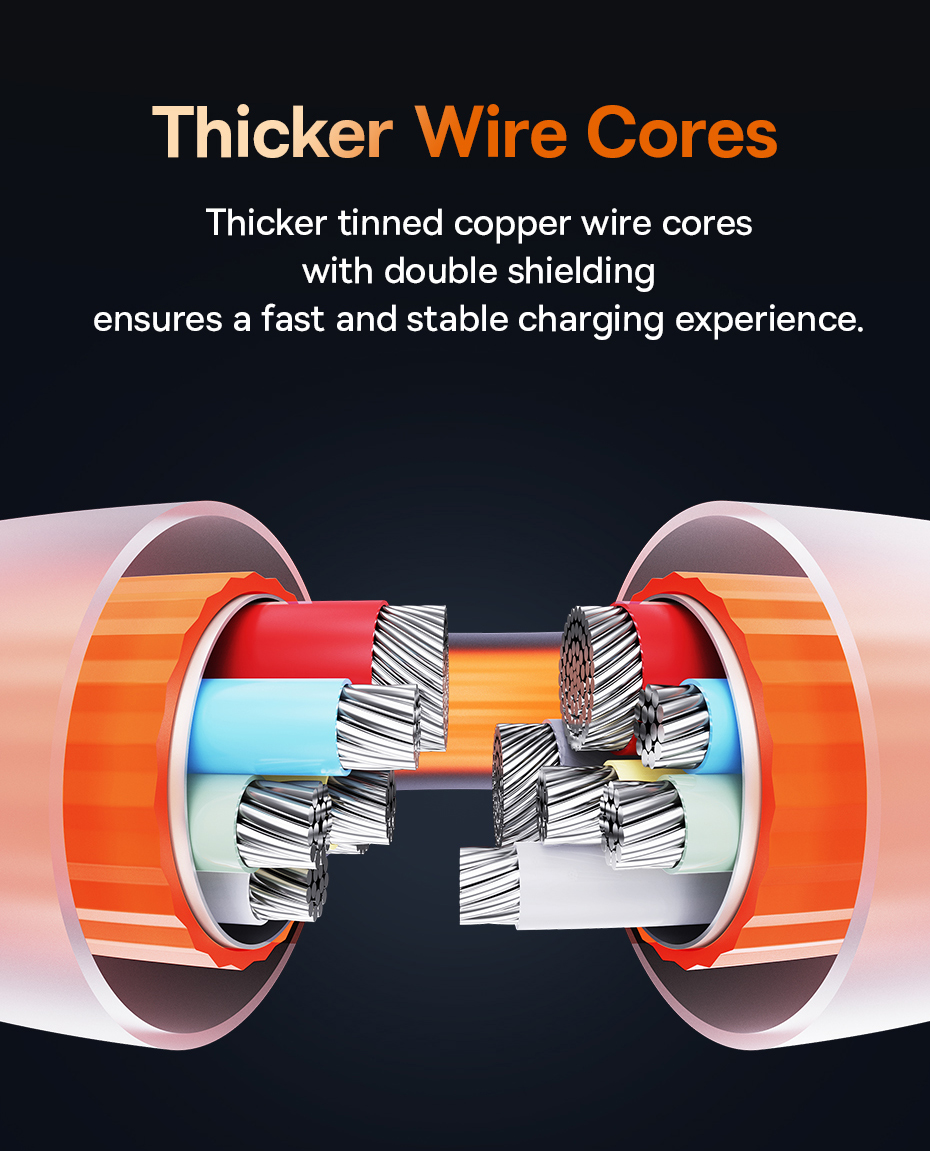 💪 KẾT CẤU CHẮC CHẮN, DÀY DẶN VƯỢT TRỘI: Thân cáp dày 6mm, dày hơn gần gấp đôi so với cáp thông thường. Cấu trúc lõi đồng được gia cố giúp truyền tải điện năng ổn định, không bị nóng và tăng cường độ bền tổng thể.
