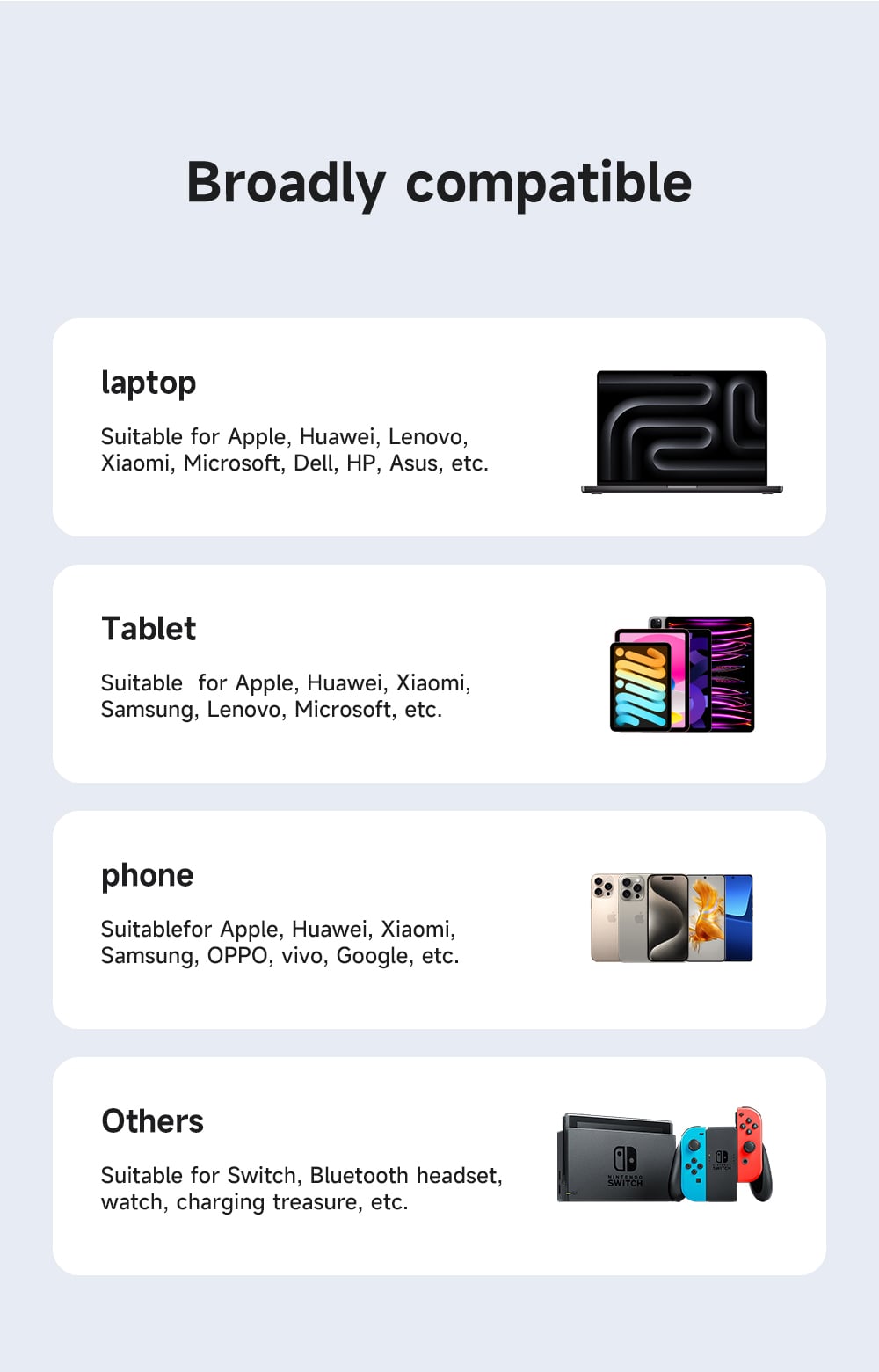 ○ Tương thích: Sạc nhanh cho laptop, máy tính bảng, điện thoại và các thiết bị khác.
