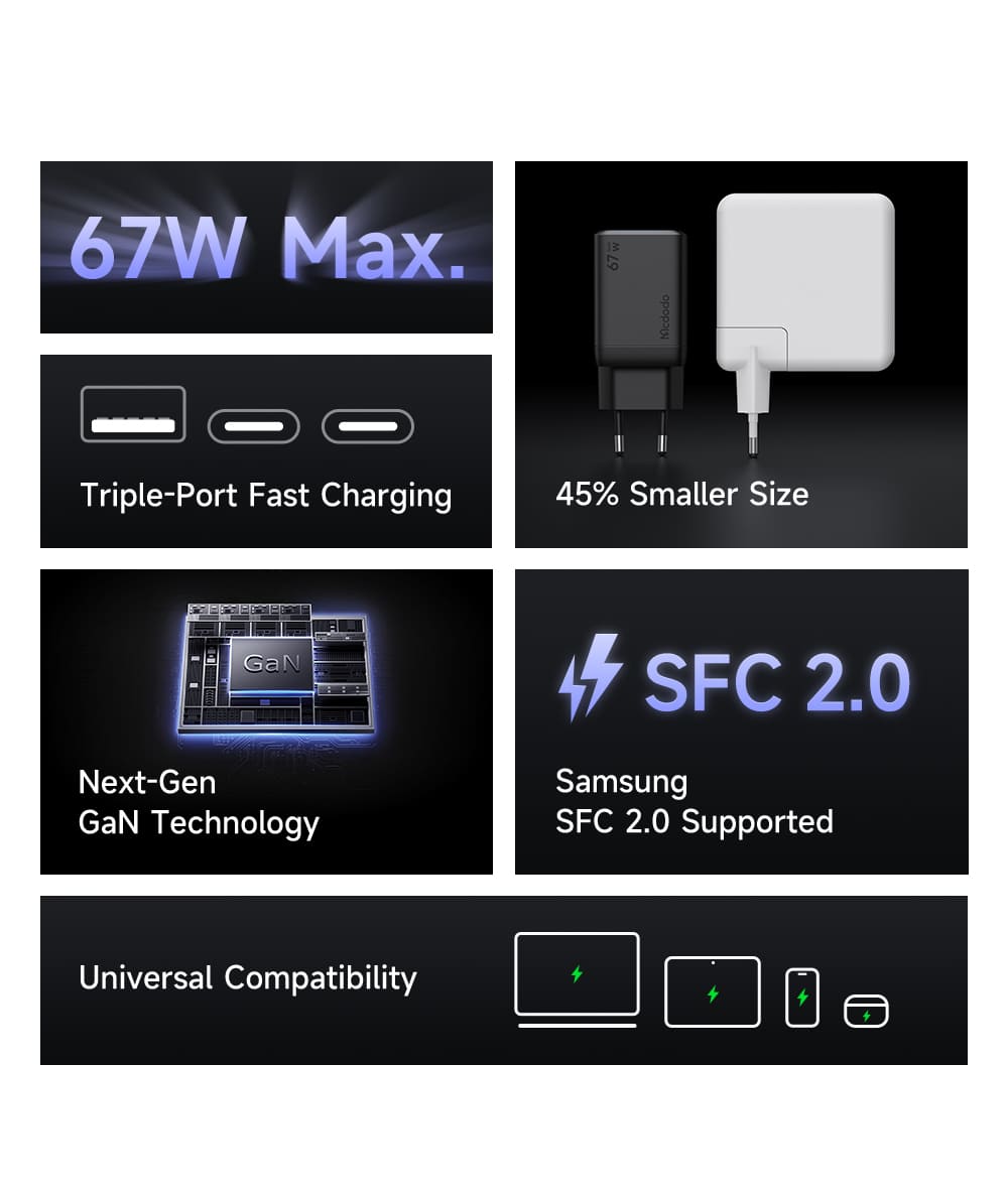 Thay thế tất cả các củ sạc cồng kềnh của bạn chỉ bằng một thiết bị duy nhất! Củ sạc Mcdodo Gana Mini 67W với công nghệ GaN tiên tiến, cung cấp sức mạnh để sạc nhanh cho cả laptop, máy tính bảng và điện thoại trong một thiết kế nhỏ gọn đến kinh ngạc.