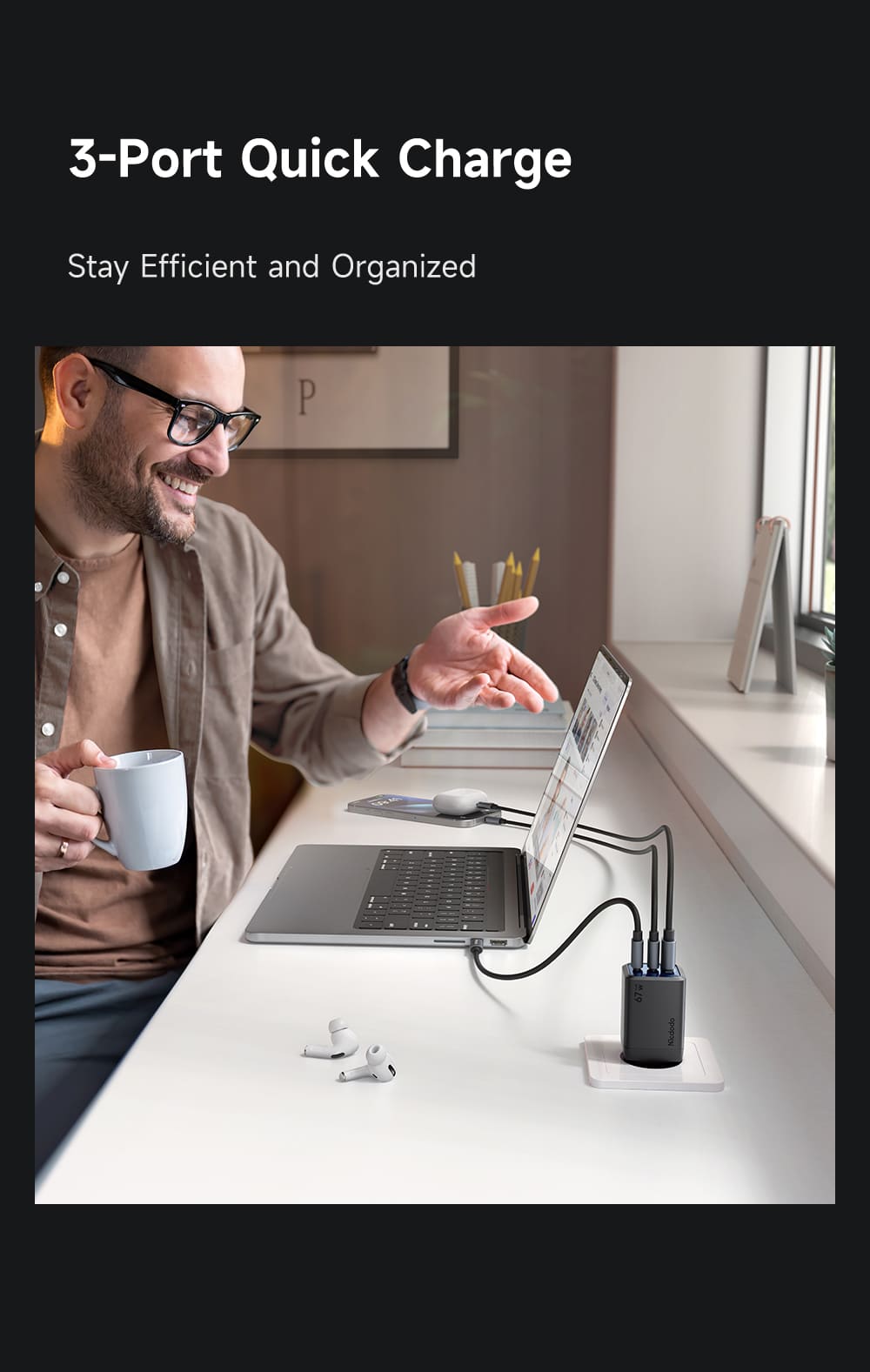 Công suất 67W mạnh mẽ: Hỗ trợ sạc nhanh Power Delivery cho laptop, máy tính bảng và điện thoại.