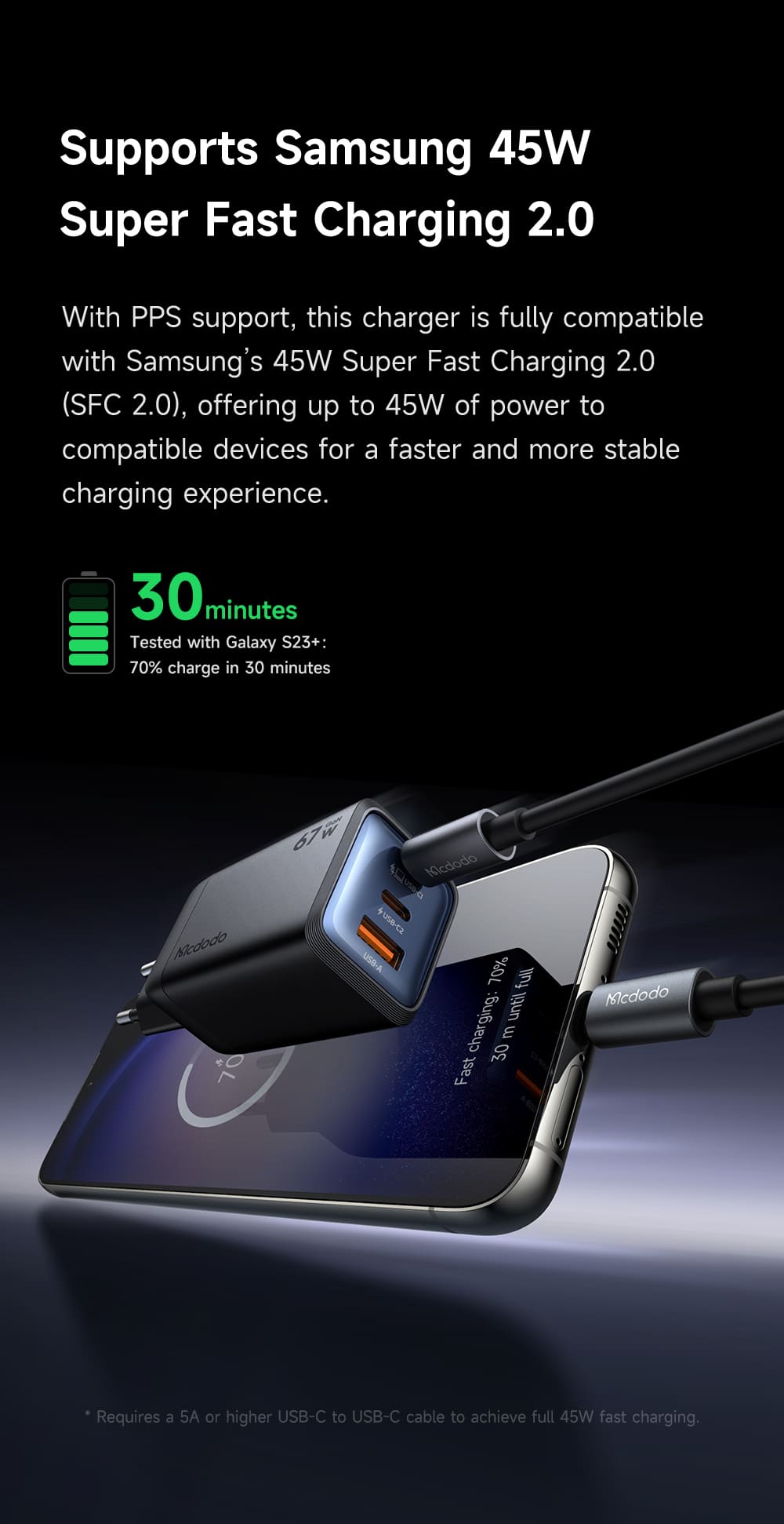 Tương thích đa giao thức: Hỗ trợ sạc nhanh PD, QC, PPS (cho Samsung Super Fast Charging 2.0) và các chuẩn khác.