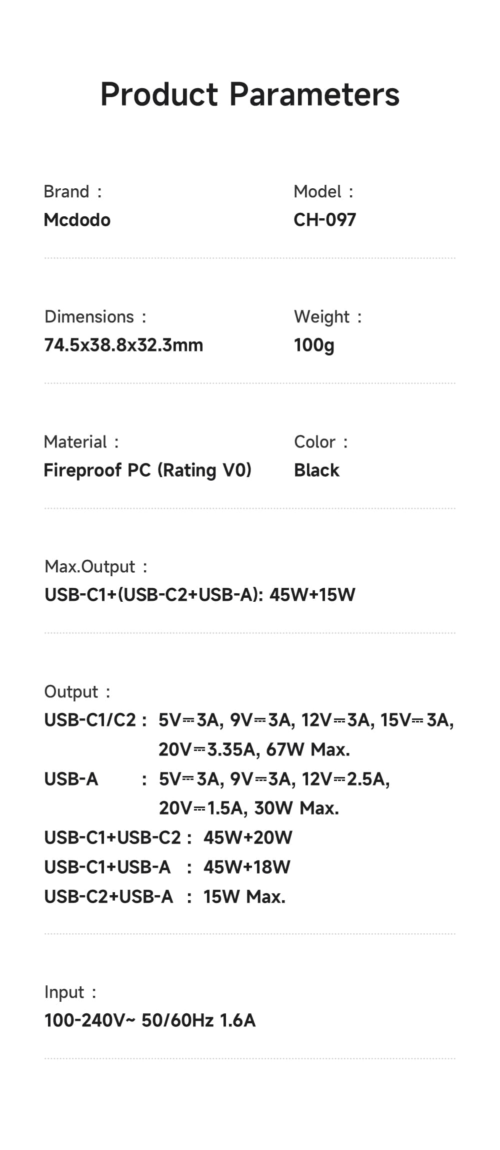 | Type-C1 + Type-C2 Output | 45W + 20W |