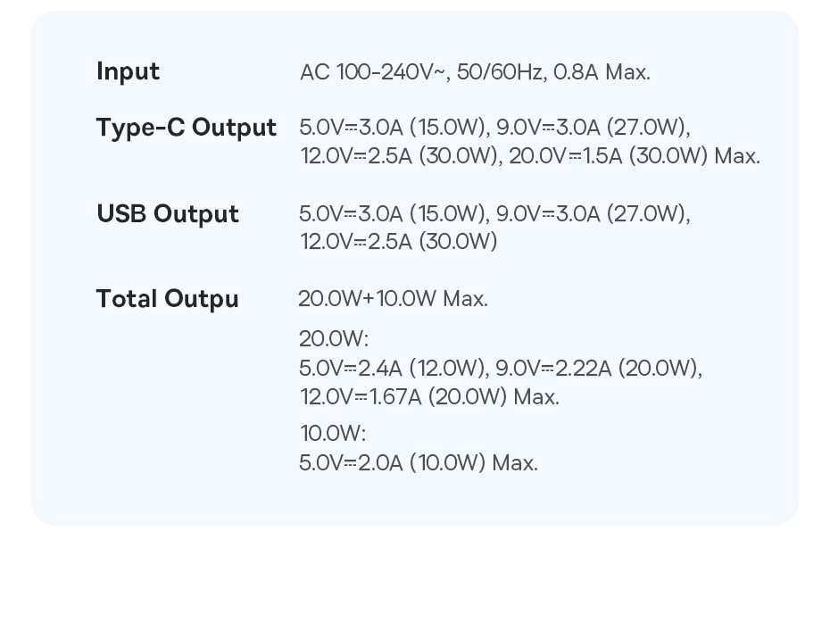 | Total Output | 20W +10W 20W: 5V-2.4A, 9V-2.22A, 12V-1.67A 10W: 5V-2A |