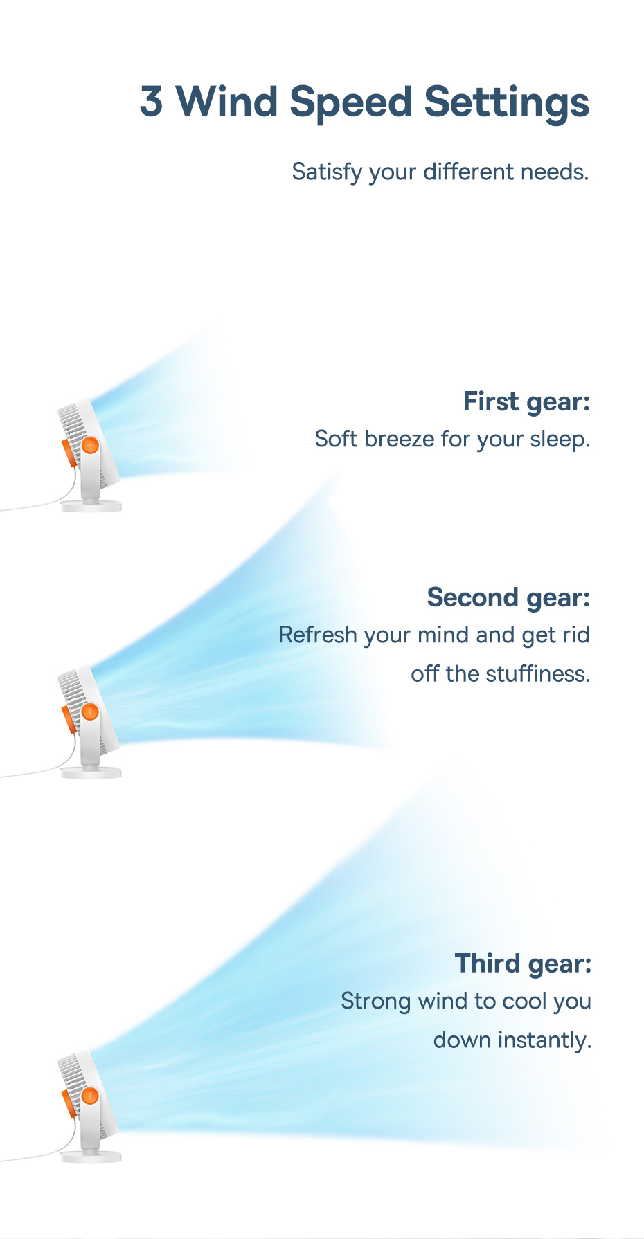 3 cấp độ gió điều chỉnh: Phù hợp với nhu cầu làm mát khác nhau – từ nhẹ nhàng đến mạnh mẽ.