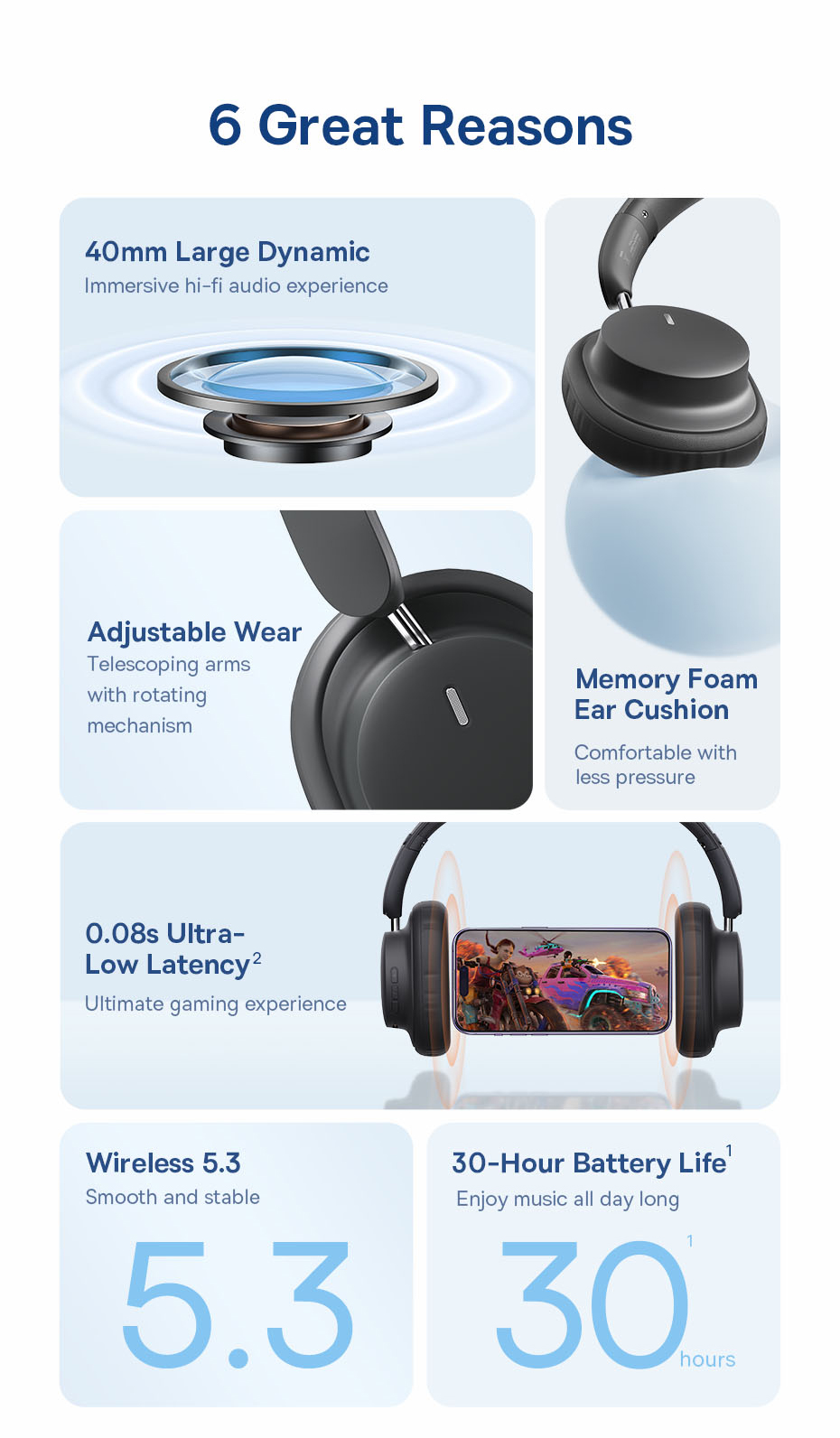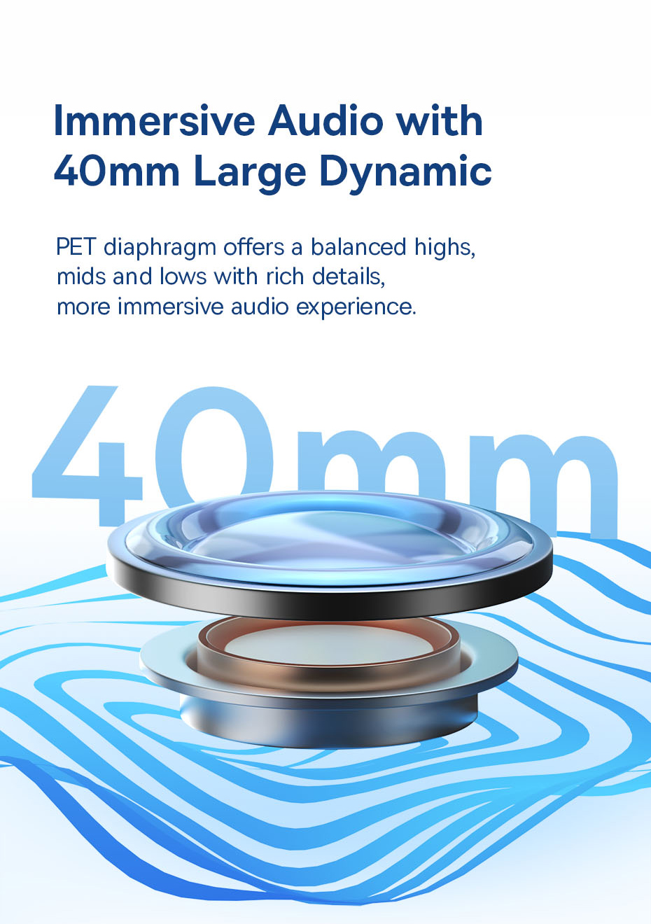 🎶 Âm Thanh Sống Động, Bass Mạnh Mẽ: Màng loa dynamic lớn 40mm mang lại chất âm mạnh mẽ với âm bass sâu lắng và các chi tiết âm thanh phong phú, cho trải nghiệm nghe nhạc đắm chìm và sống động.