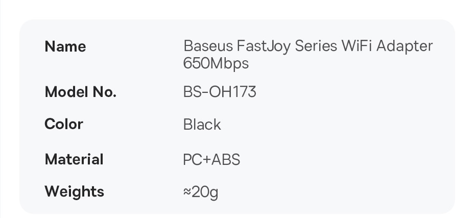 | Tên | Thiết bị nhận tín hiệu Wifi Baseus FastJoy Series WiFi Adapter |