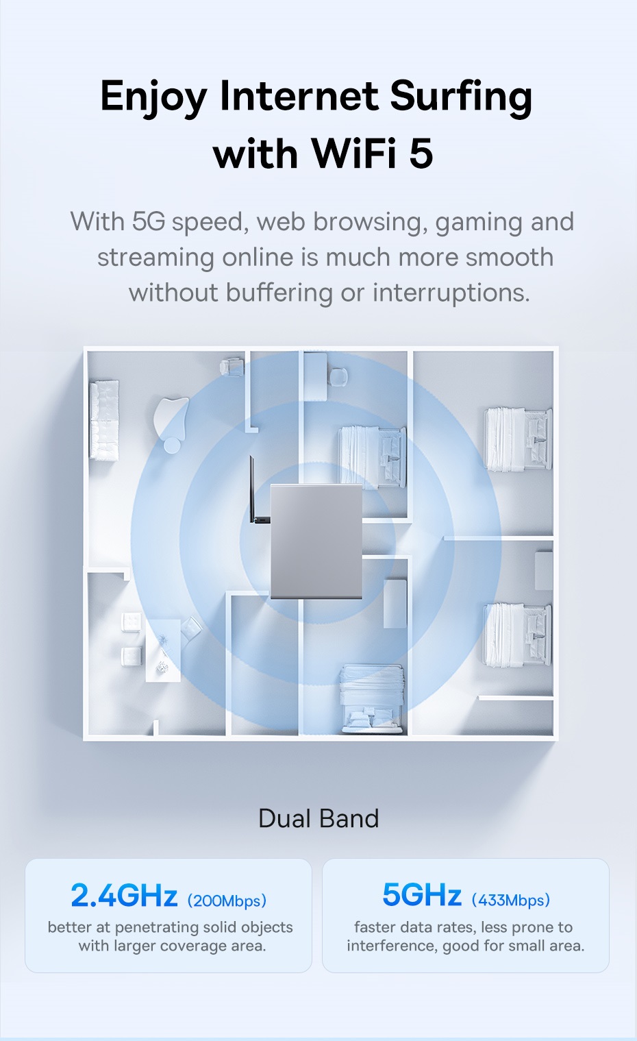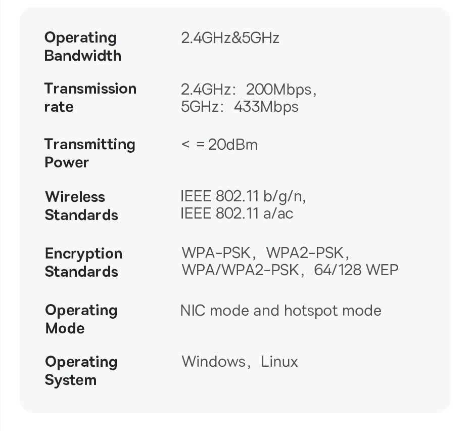 | Tốc độ truyền dữ liệu | 2.4GHz: 200Mbps 5GHz: 433Mbps |