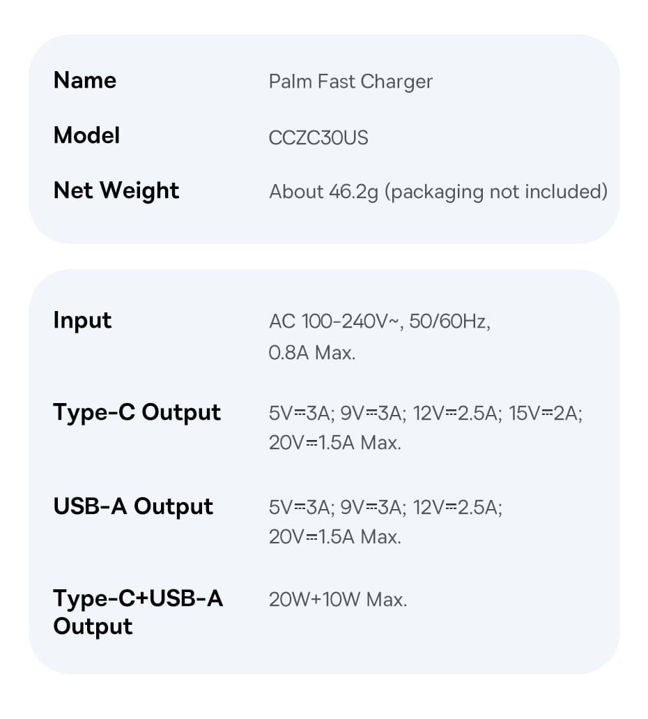 | Type-C + USB Output | 20W + 10W Max. |