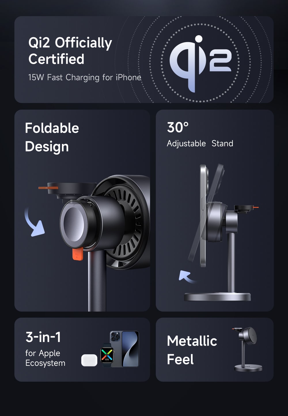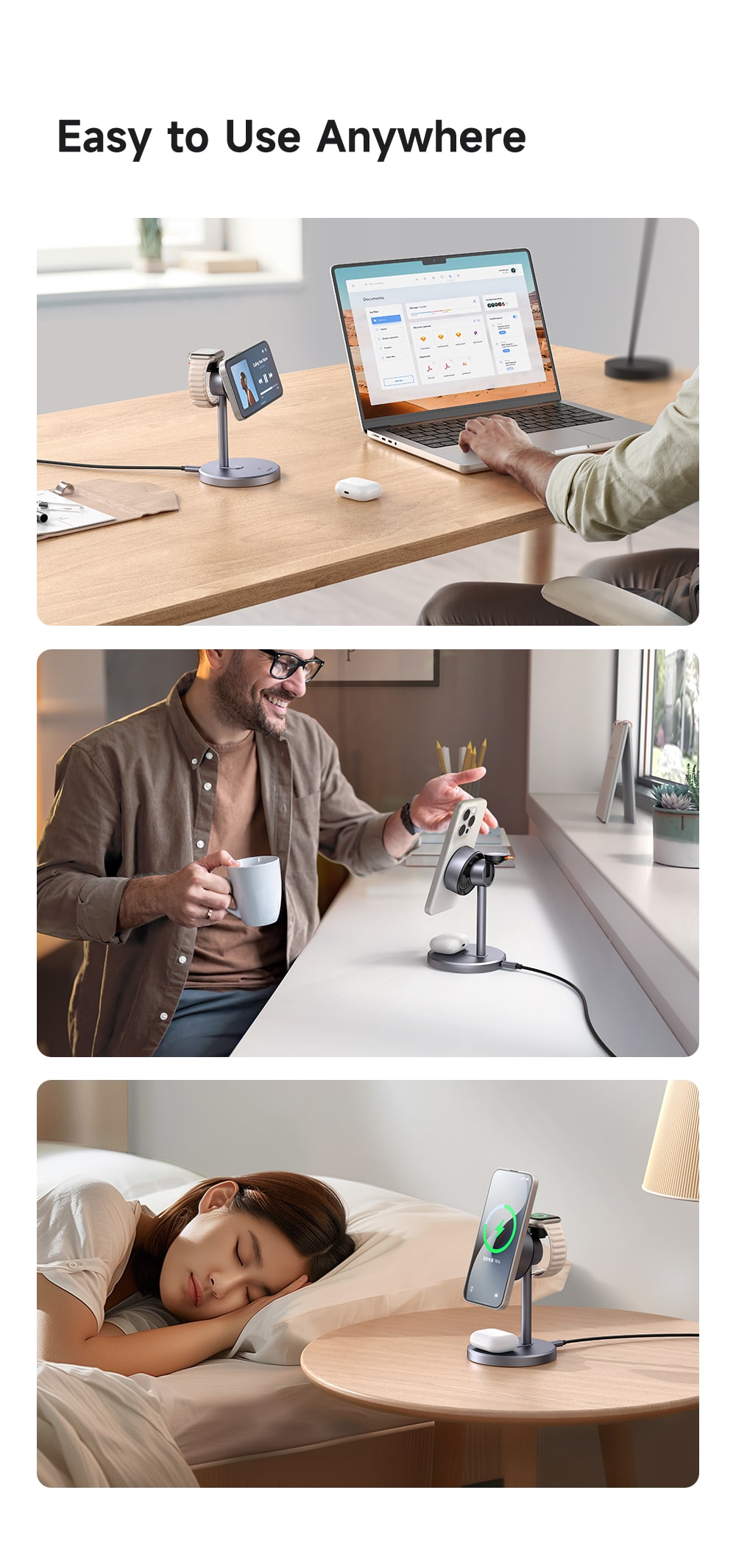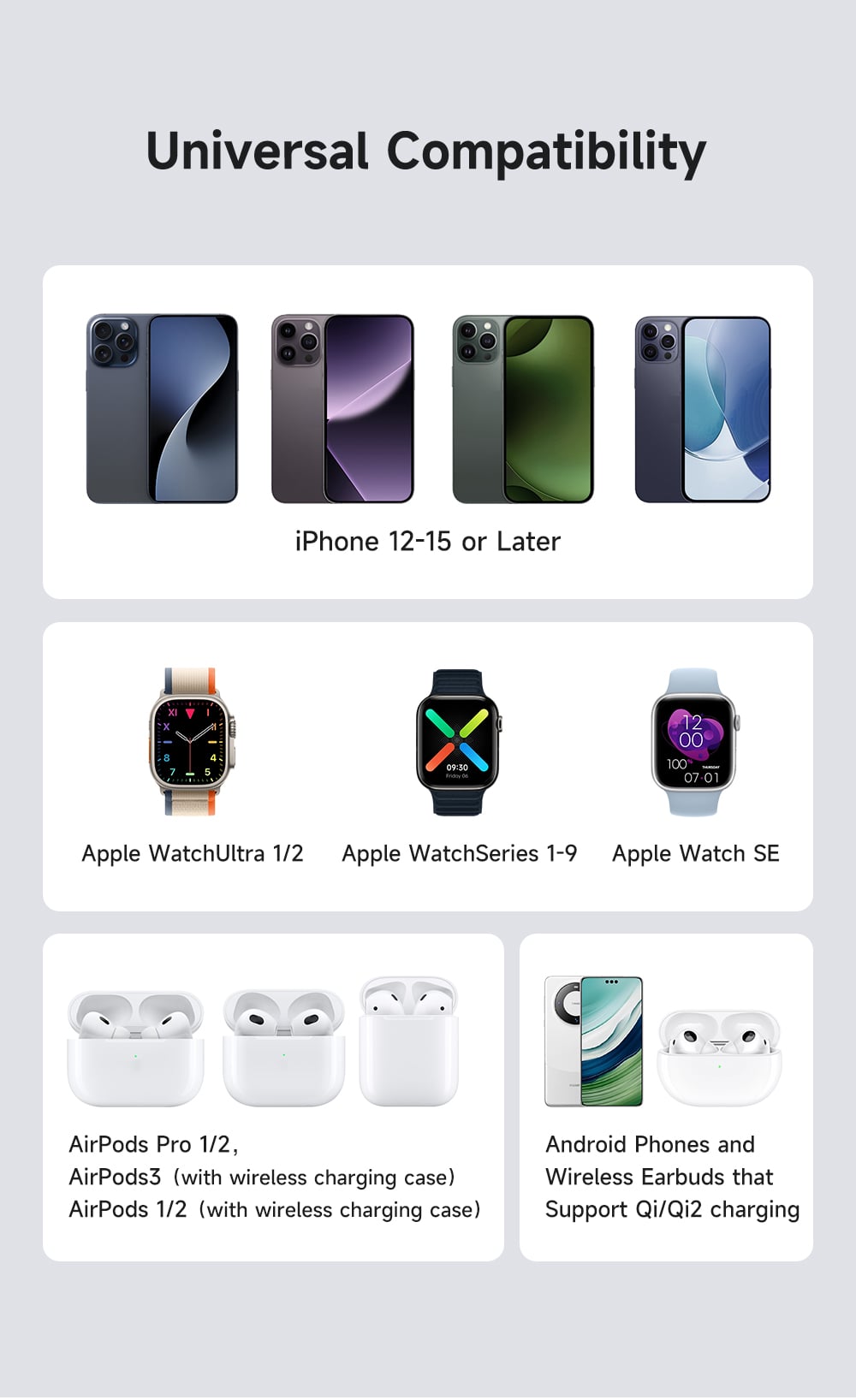 🔋🔋🔋 Sạc Cùng Lúc 3 Thiết Bị: Thiết kế thông minh cho phép bạn sạc đồng thời 3 thiết bị: điện thoại (qua đế hít nam châm), đồng hồ thông minh (qua đế sạc gập gọn), và tai nghe không dây (trên mặt đế). Dọn dẹp không gian của bạn chỉ với một thiết bị và một sợi cáp duy nhất.