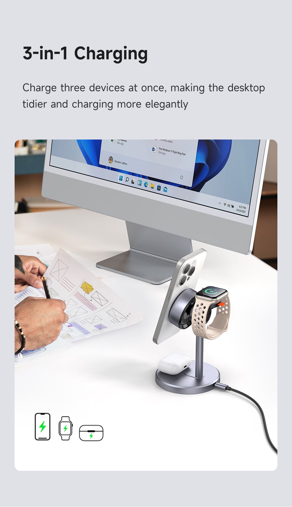 ○ Thiết kế 3 trong 1, sạc đồng thời điện thoại, đồng hồ và tai nghe.