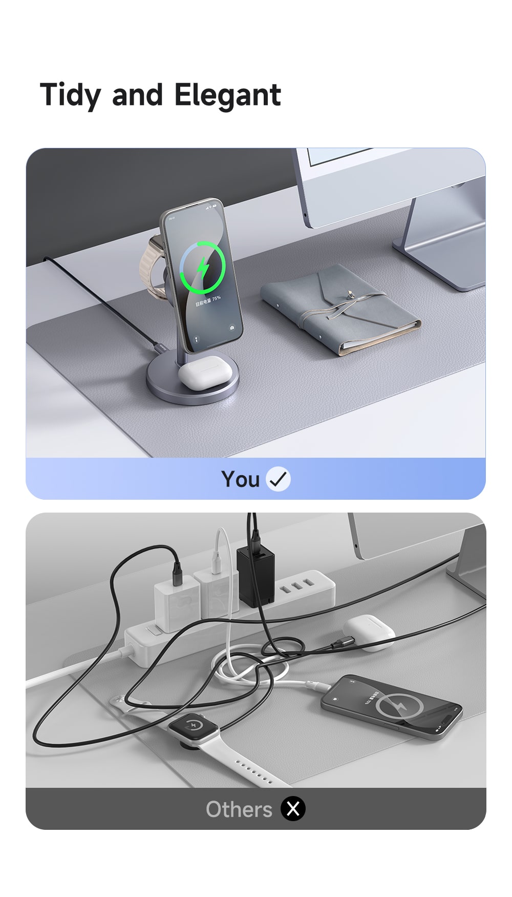 📐 Thiết Kế Linh Hoạt, Tùy Chỉnh Góc Nhìn: Đế sạc điện thoại có thể điều chỉnh góc nghiêng, trong khi đế sạc đồng hồ có thể gập gọn lại. Dễ dàng tùy chỉnh để có góc nhìn hoàn hảo khi xem video, gọi điện video hoặc sử dụng các tính năng hiển thị của điện thoại.