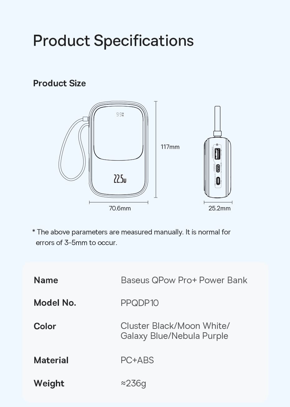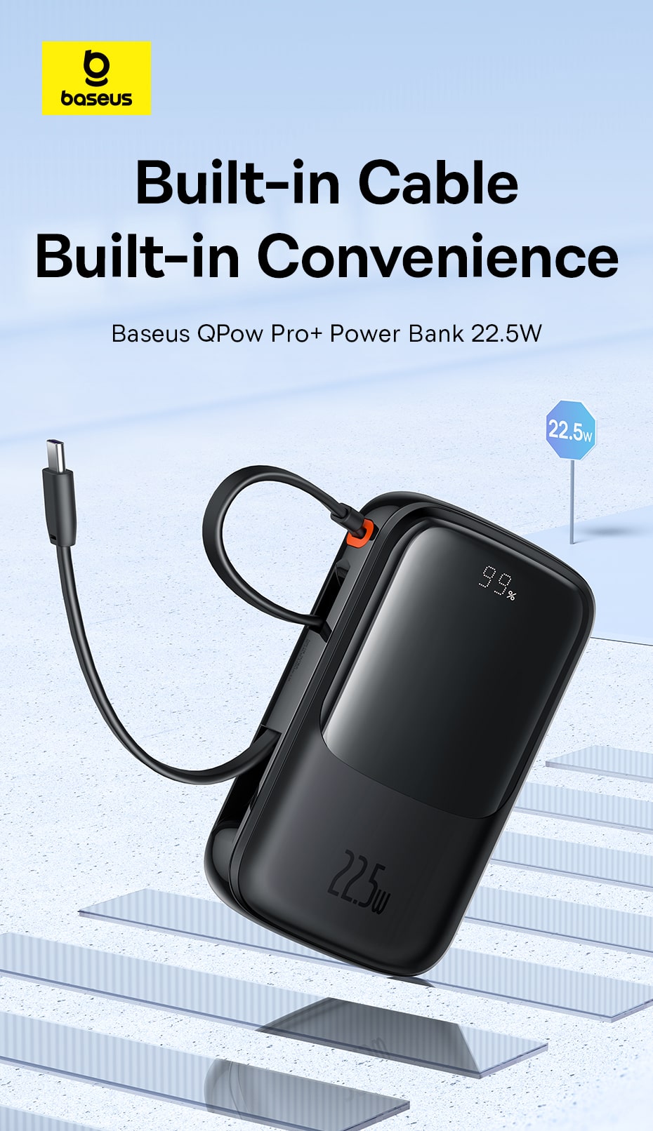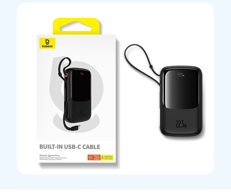 Sạc Dự Phòng Baseus Qpow Pro+ 10000mAh | Kèm Sẵn Cáp Type-C, Sạc Siêu Nhanh 22.5W