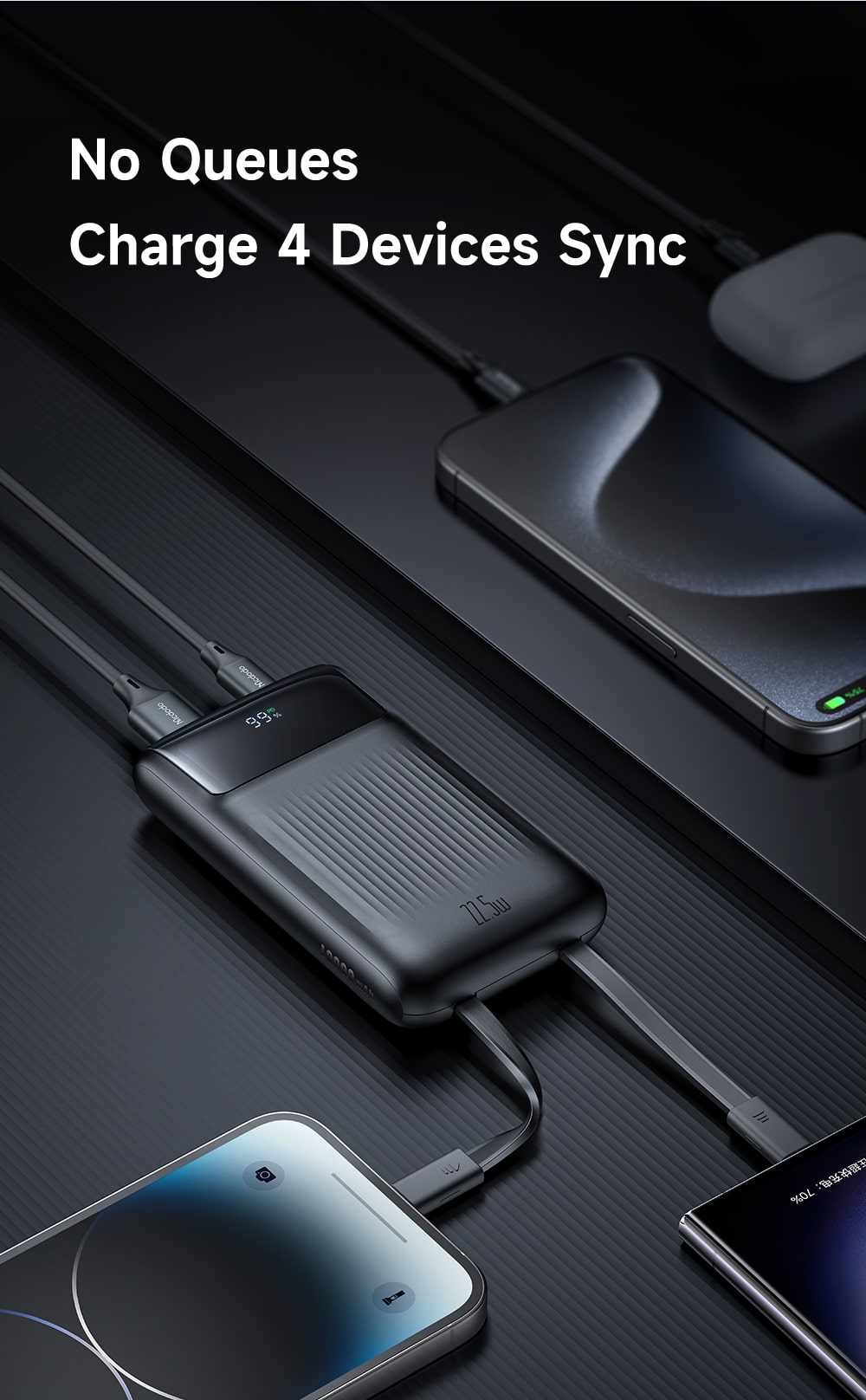 👨👩👧👦 TRẠM SẠC DI ĐỘNG - SẠC CÙNG LÚC 4 THIẾT BỊ: Một thiết bị cho tất cả! Ngoài 2 dây sạc tích hợp, pin còn có thêm 1 cổng ra USB và 1 cổng vào/ra Type-C, cho phép bạn nạp năng lượng cho 4 thiết bị cùng một lúc. Hoàn hảo để chia sẻ pin với bạn bè và gia đình.