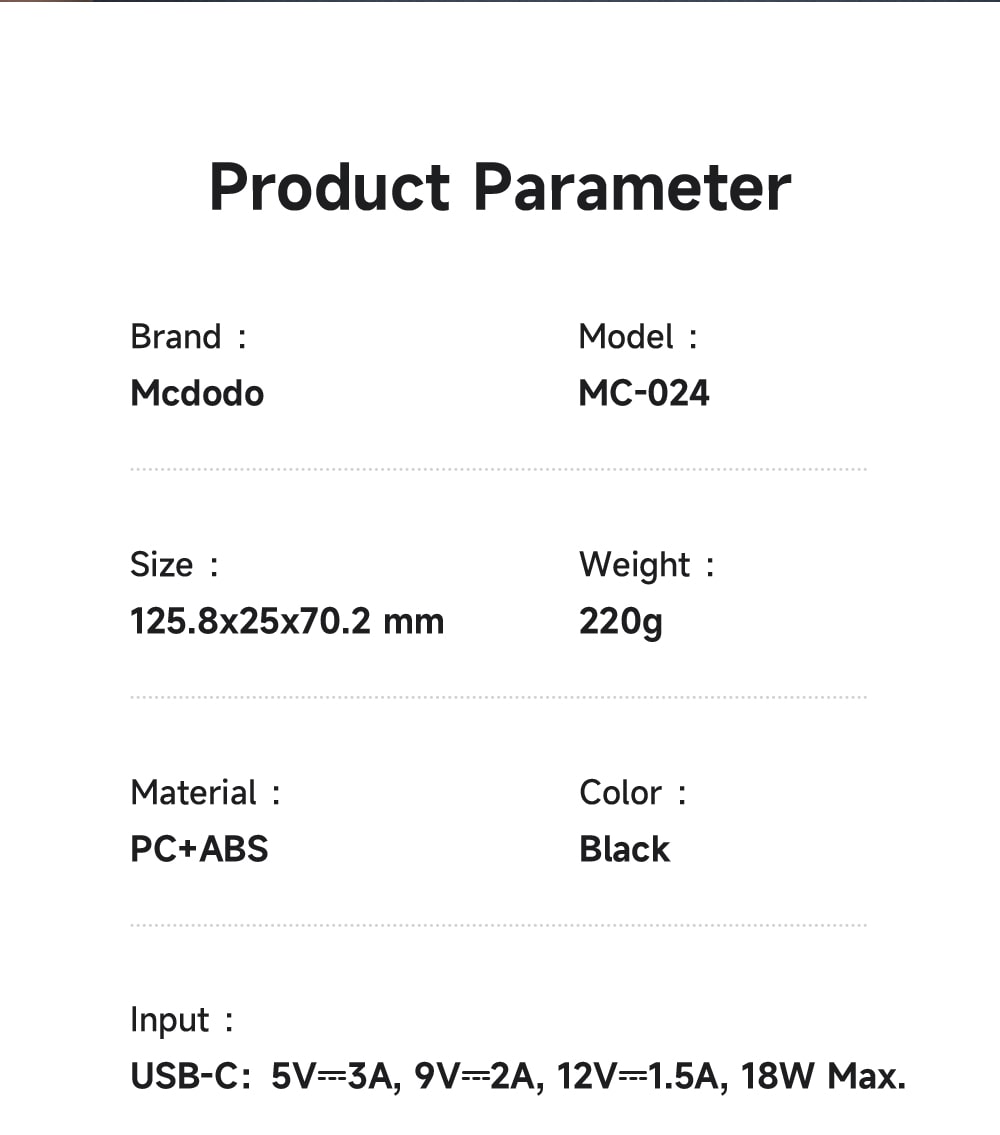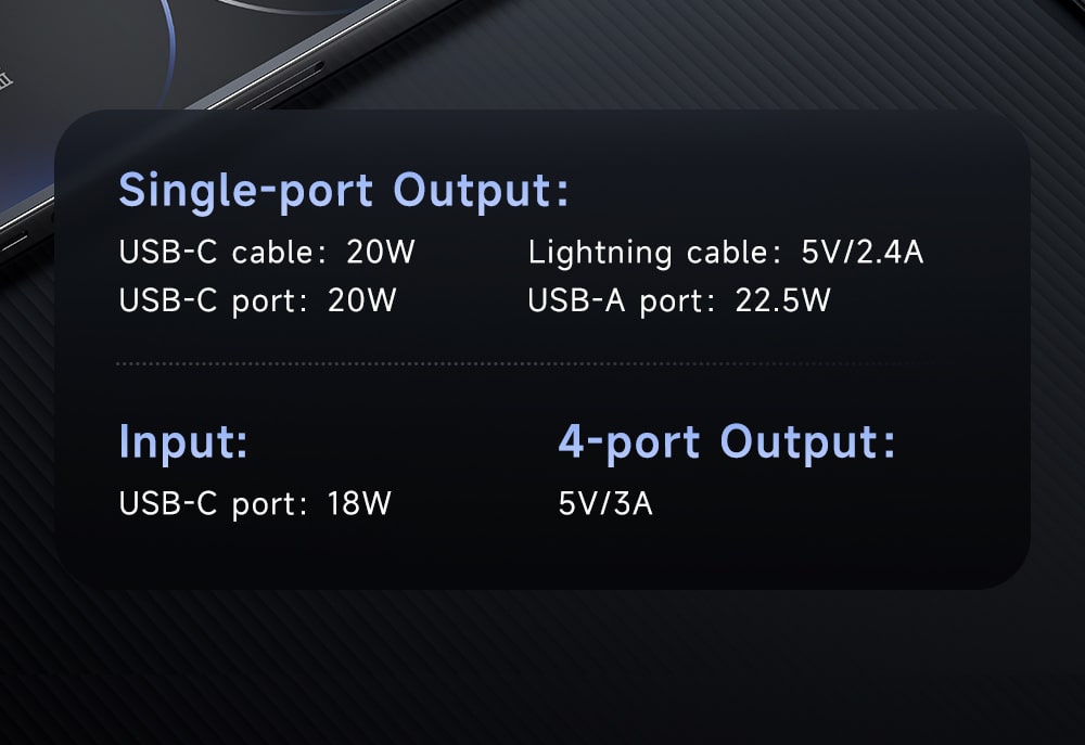 | Type-C Output | 5V-3A, 9V-2.22A, 12V-1.67A 20W |