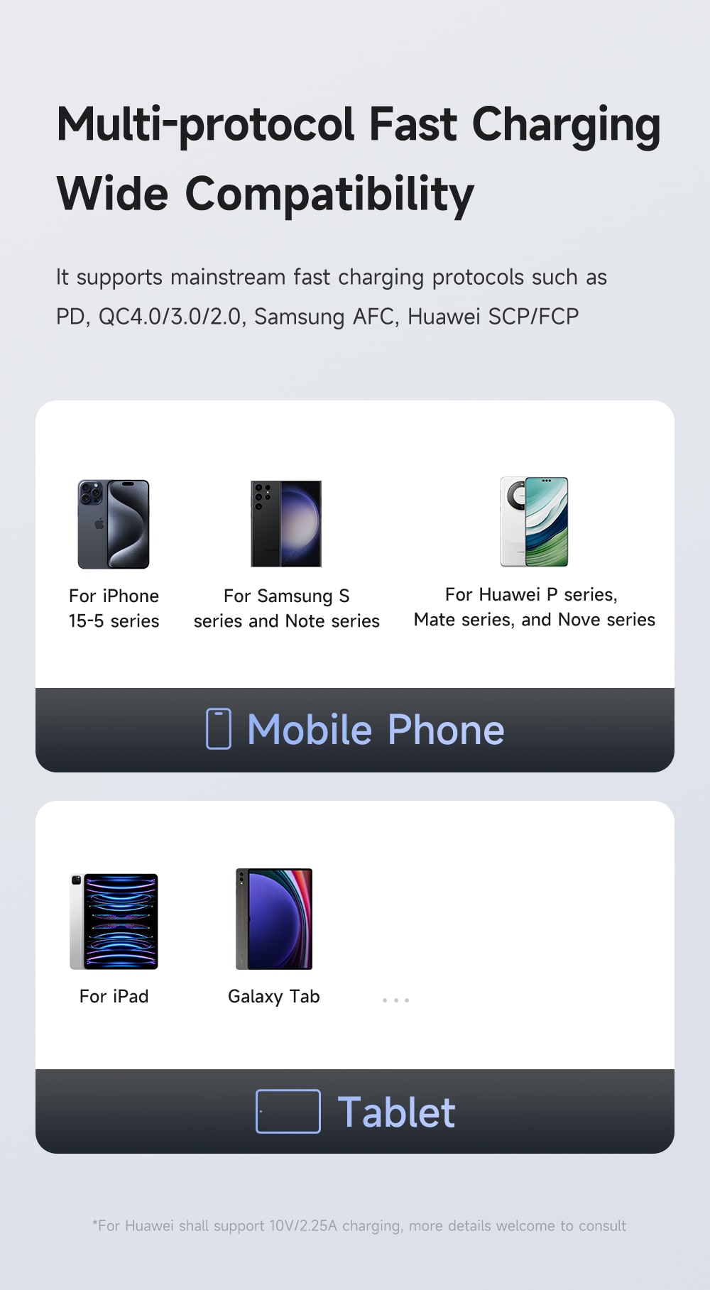 | USB Output | 5V-3A, 9V-2A, 10V-2.25A, 12V-1.5A 22.5W |