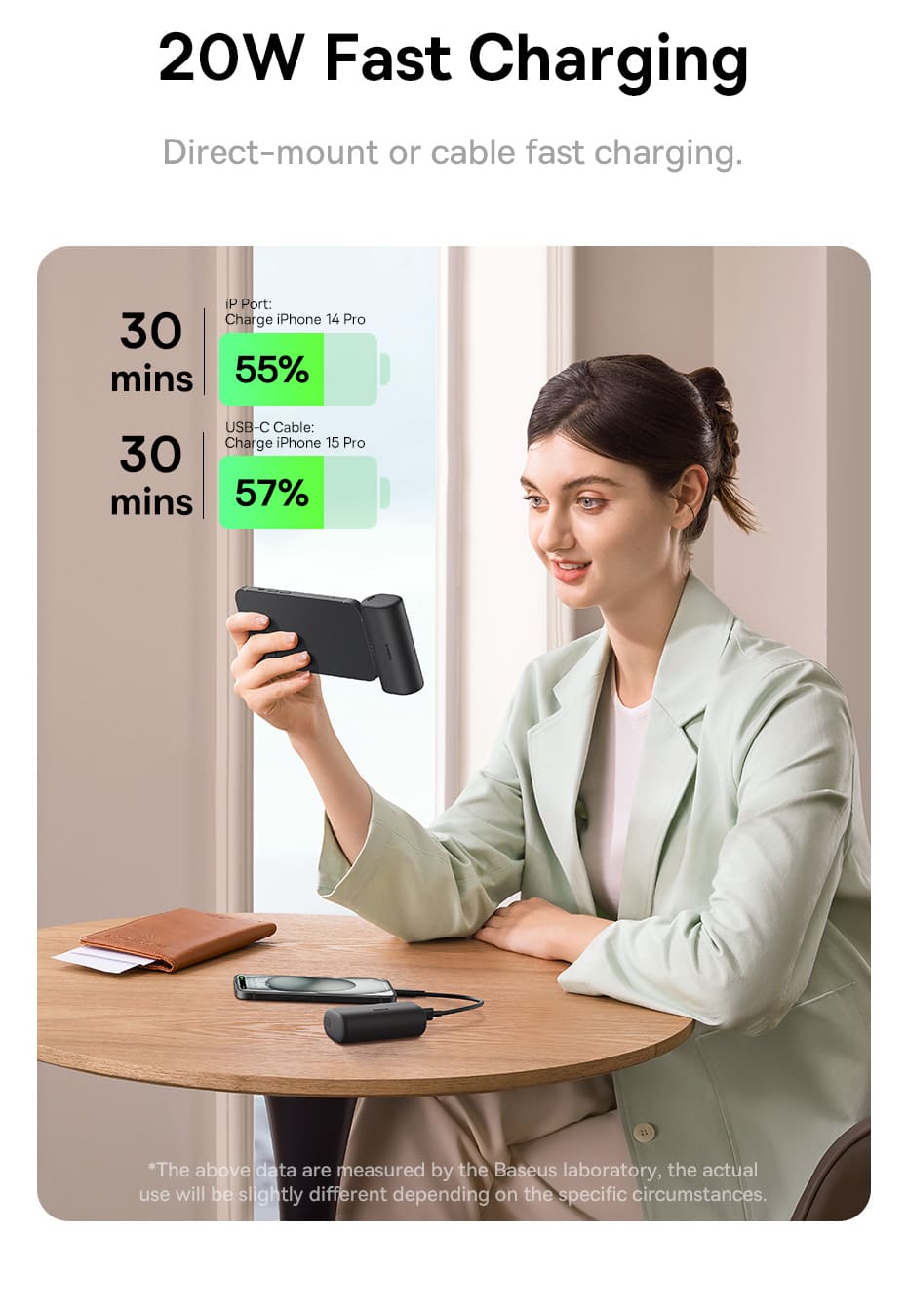 ⚡️ Sạc Nhanh PD 20W Vượt Trội: Dù nhỏ bé, sạc dự phòng vẫn cung cấp công suất sạc nhanh Power Delivery 20W qua cả đầu cắm liền thân và cổng Type-C, giúp nạp 60% pin cho điện thoại chỉ trong 30 phút.