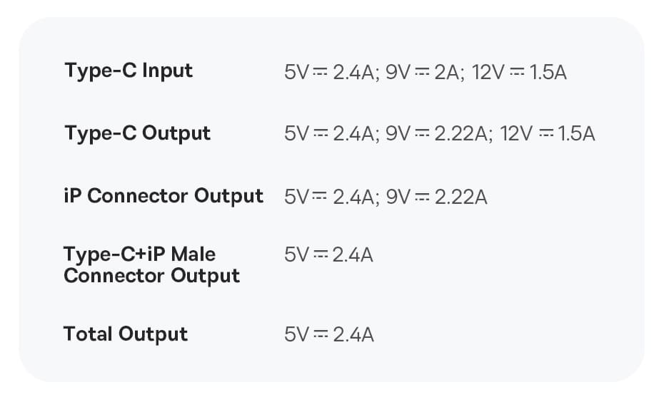 | Type-C + iP Male Connector Output | 5V-2.4A |